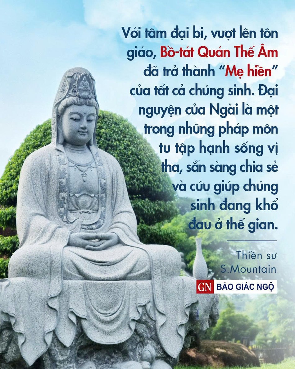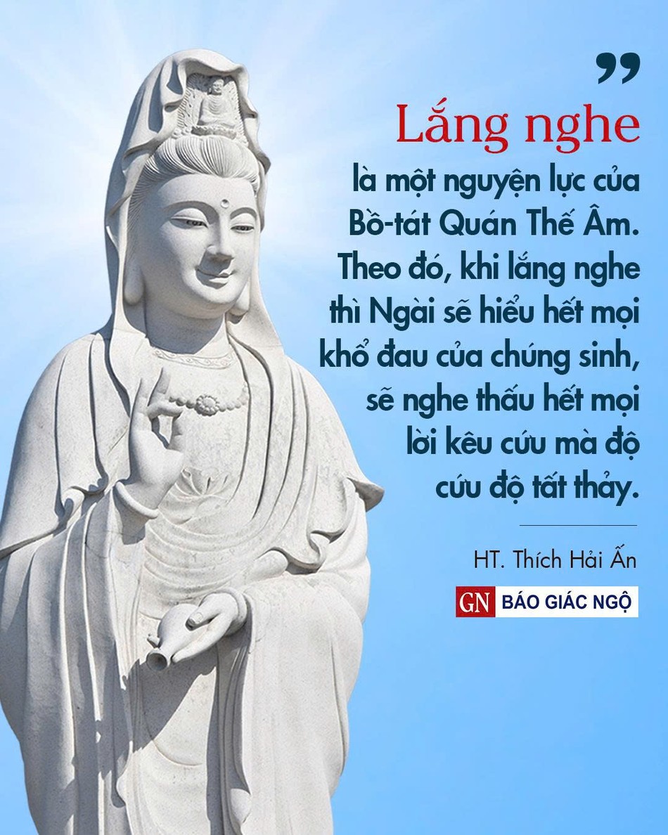GNO - Bồ-tát Quán Thế Âm là biểu trưng của tình thương, che chở và cứu giúp, gọi là từ bi. Khi trong ta có từ bi, vậy là Bồ-tát đang có mặt trong ta, ta chính là một phần hóa thân của Bồ-tát. Ngài còn biểu trưng cho hạnh lắng nghe. Nghe tiếng đau khổ, lo toan, sợ hãi… của mọi người và mọi loài...