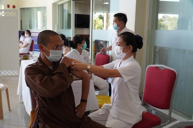 Hiện diện tiêm vắc-xin có chư tôn đức cao niên như Hòa thượng Thích Đức Thanh, Trưởng ban Trị sự tỉnh; Hòa thượng Thích Khế Chơn, Phó Chủ tịch Hội đồng Trị sự, Phó Thường trực Ban Trị sự tỉnh cùng chư Hòa thượng Phó ban.