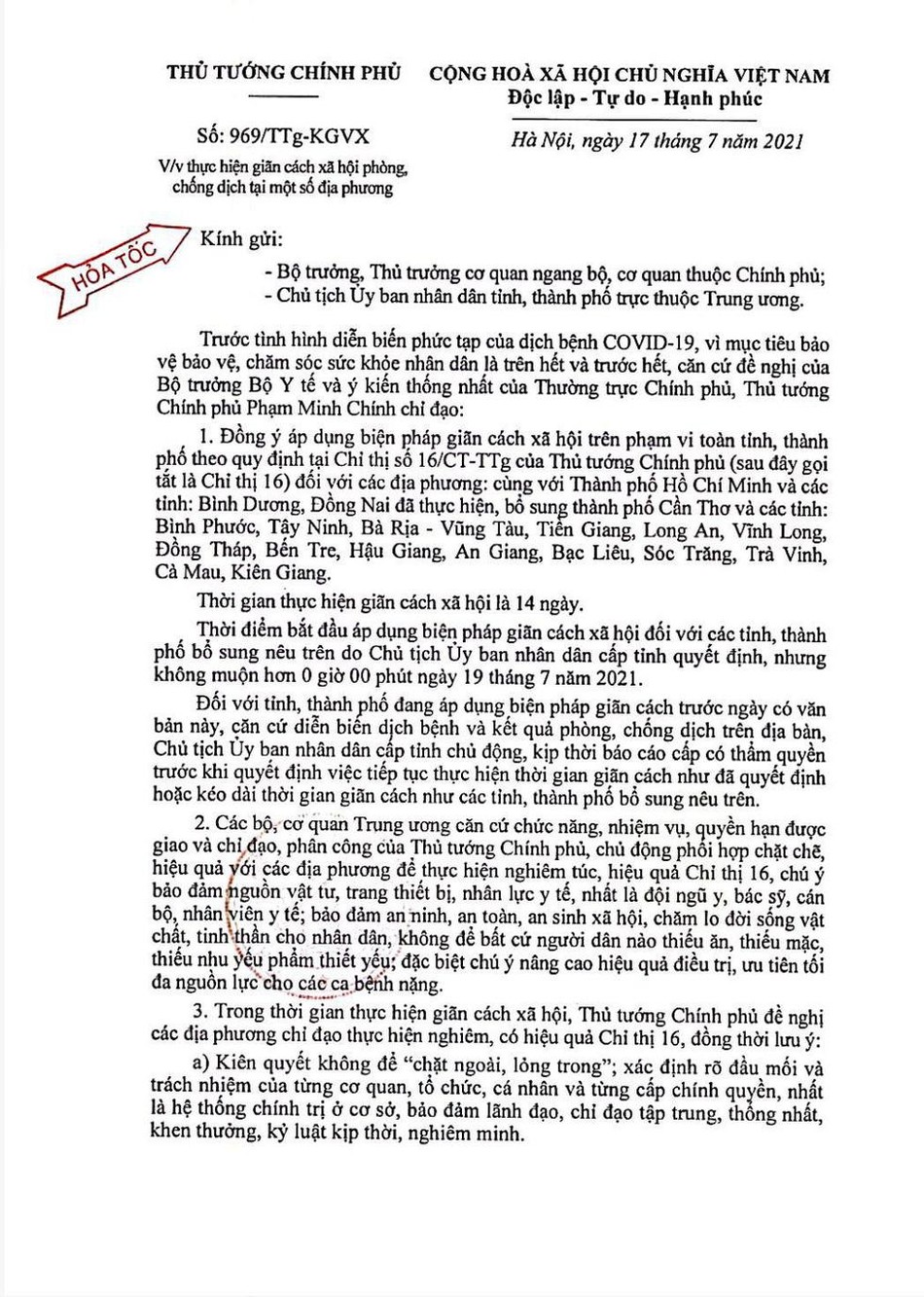 Như vậy, từ 0g ngày 19-7-2021, sẽ có 19 tỉnh, thành phố thực hiện giãn cách xã hội theo Chỉ thị 16 để phòng, chống dịch Covid-19, bao gồm: TP.HCM, Bình Dương, Đồng Nai, TP.Cần Thơ, Bình Phước, Tây Ninh, Bà Rịa - Vũng Tàu, Tiền Giang, Long An, Vĩnh Long, Đồng Tháp, Bến Tre, Hậu Giang, An Giang, Bạc Liêu, Sóc Trăng, Trà Vinh, Cà Mau và Kiên Giang.