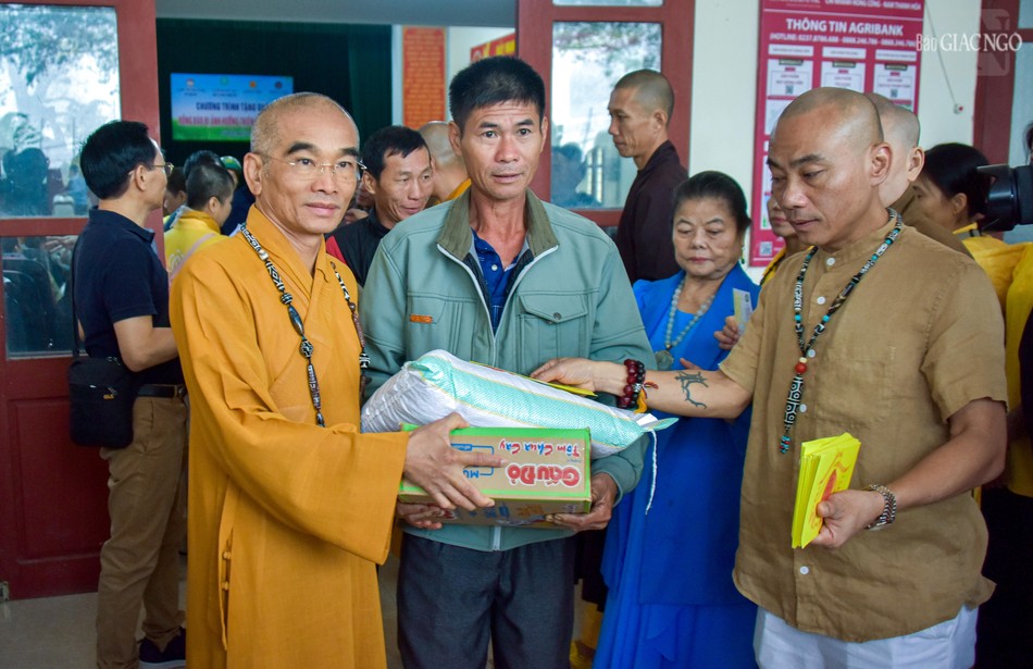 Thượng tọa Thích Tuệ Hải hỗ trợ người dân nhận quà |