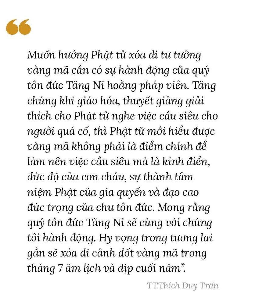 Chia sẻ với báo Giác Ngộ, Thượng tọa Thích Duy Trấn, Phó ban Đại diện Phật giáo người Hoa, Phó Thường trực Ban Trị sự GHPGVN quận 11, trụ trì chùa Liên Hoa cho biết lý do thầy “táo bạo” tuyên bố nói không với vàng mã:
