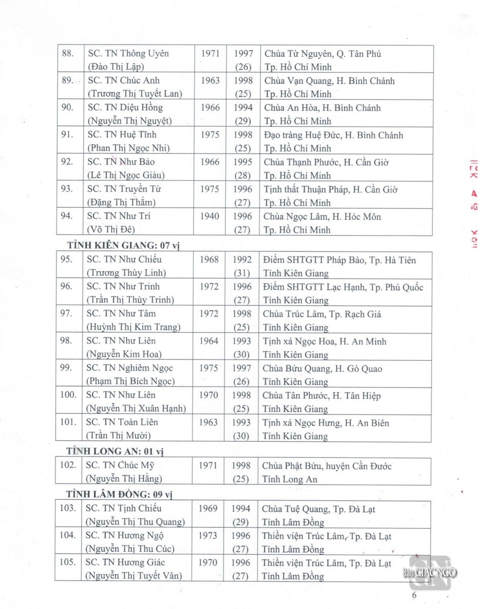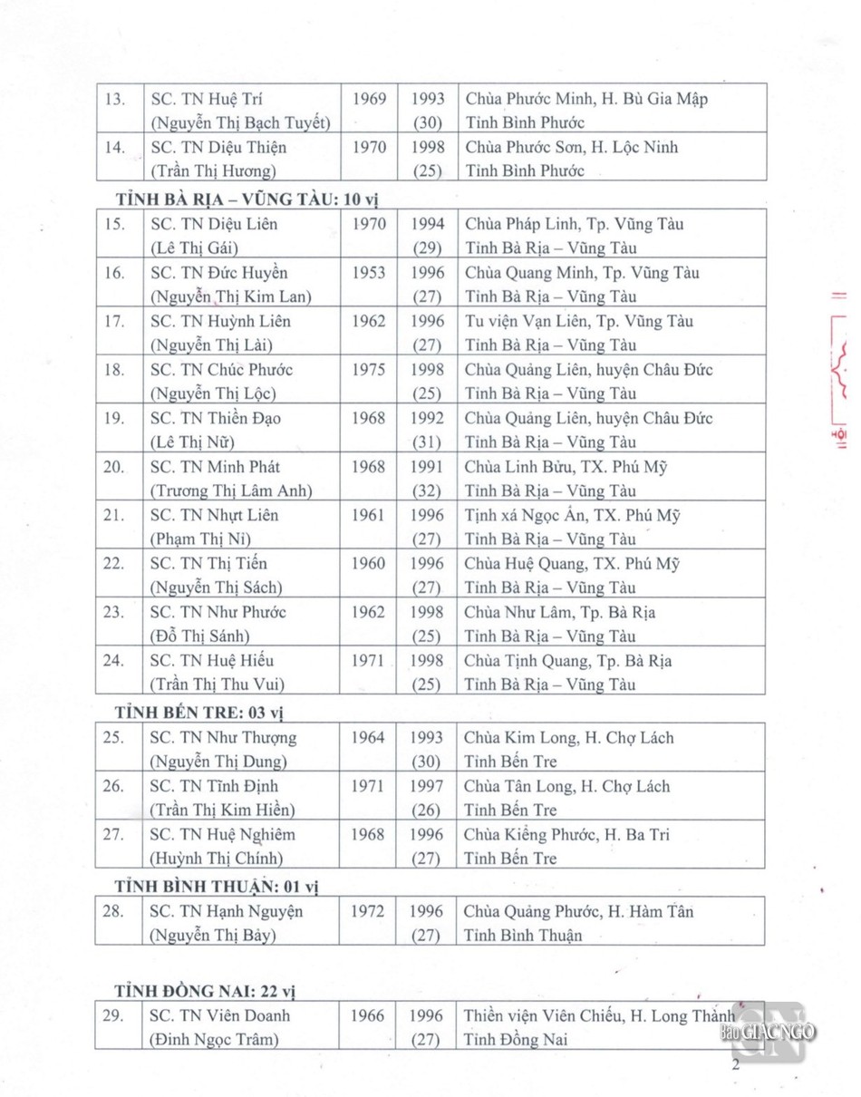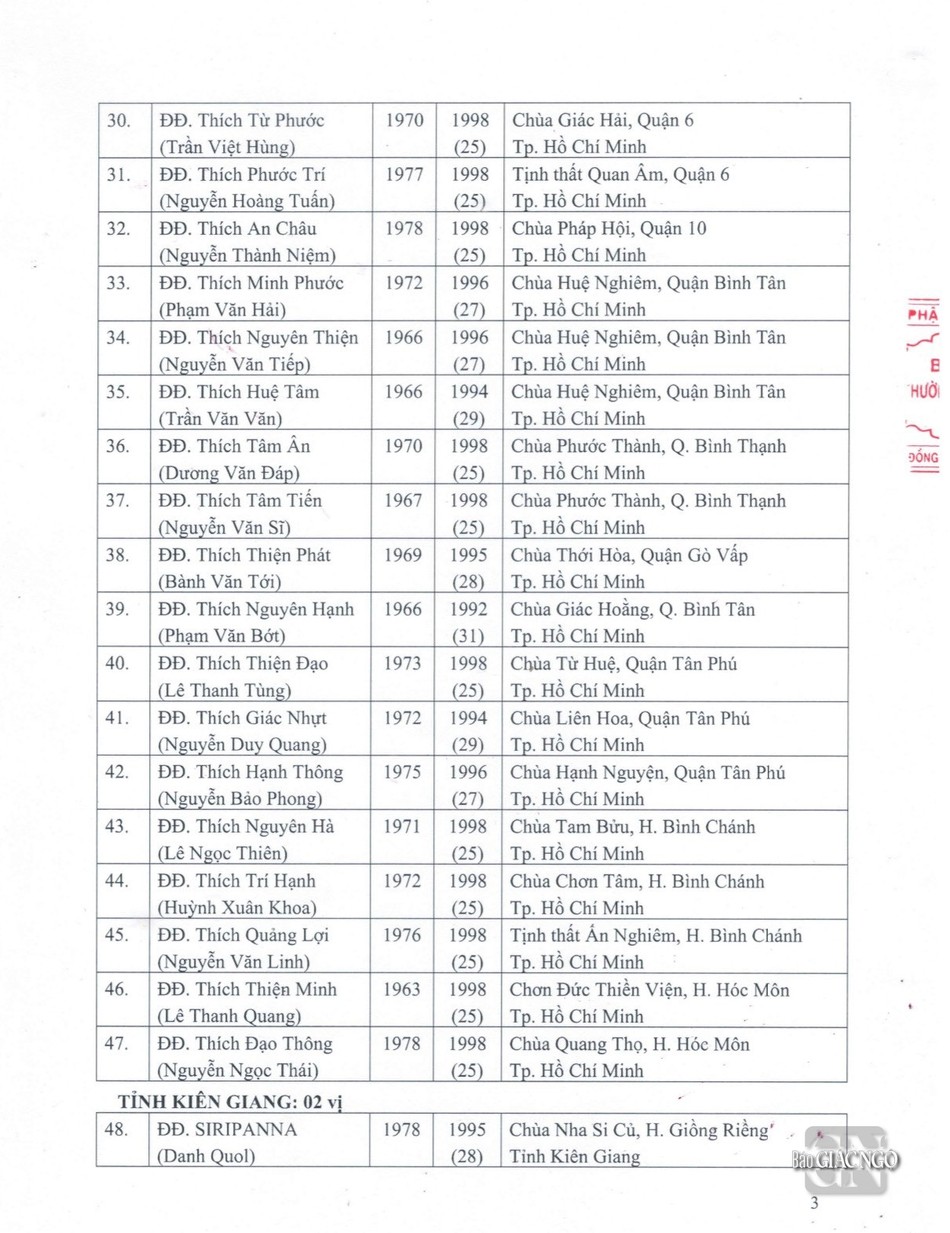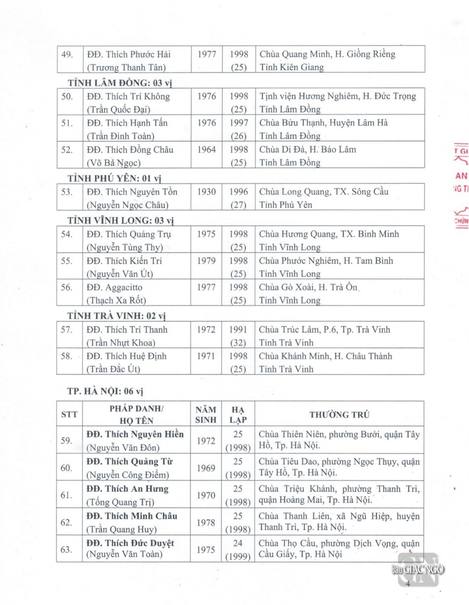 Sau đây là danh sách được Đức Pháp chủ GHPGVN ban Giáo chỉ tấn phong chính thức: