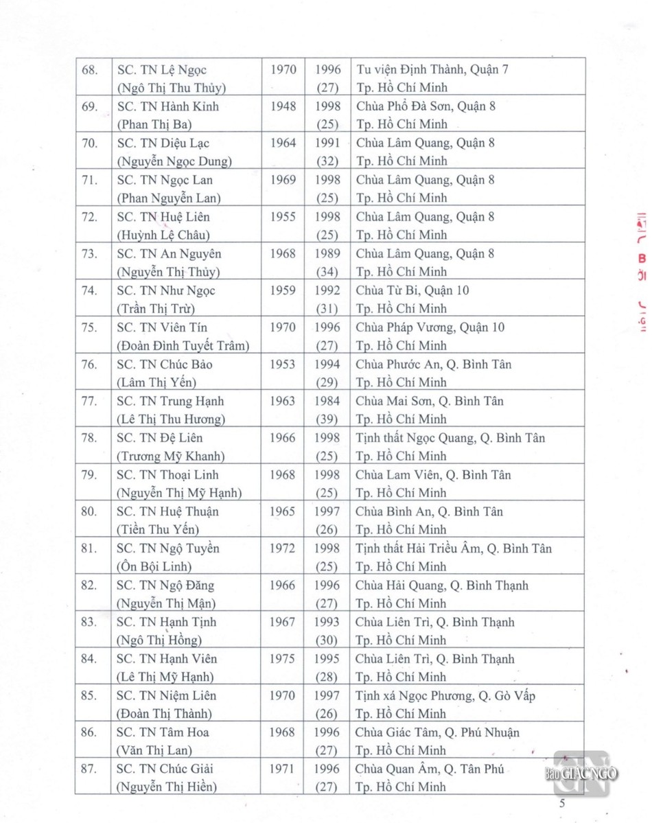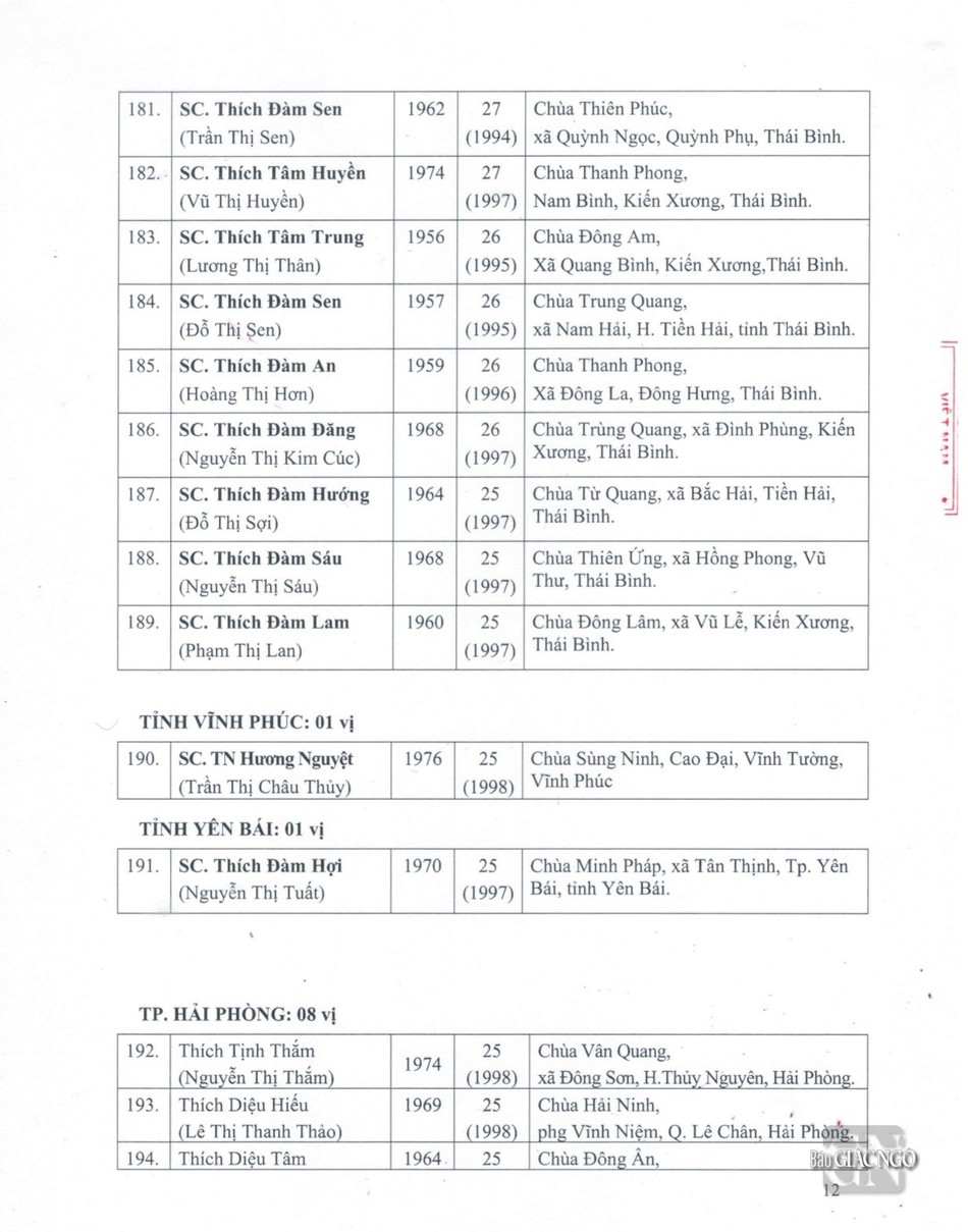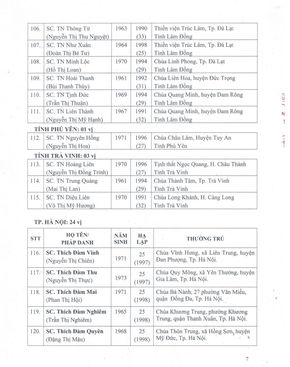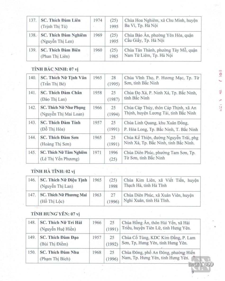 Sau đây là danh sách được Đức Pháp chủ GHPGVN ban Giáo chỉ tấn phong chính thức: