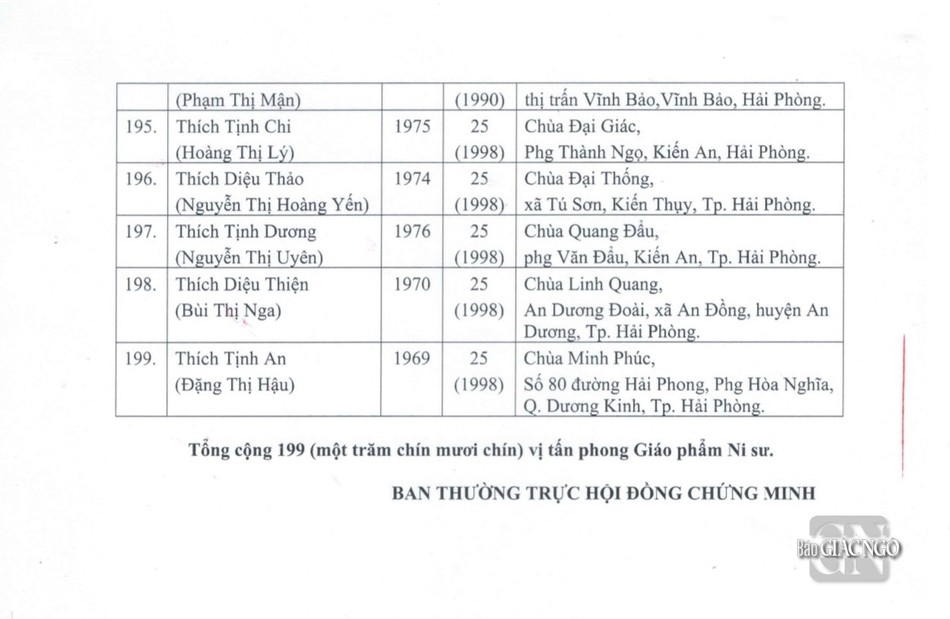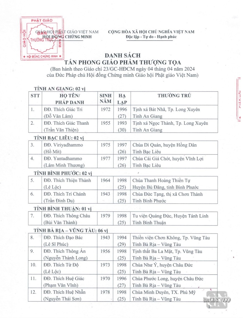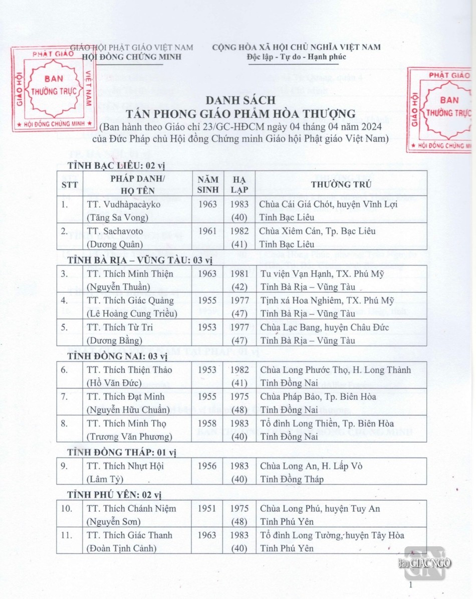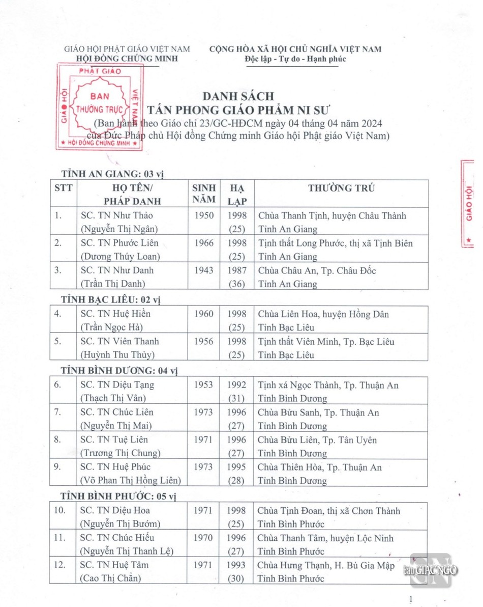 GNO - Thông tin từ Văn phòng Đức Pháp chủ GHPGVN, căn cứ Nghị quyết Hội nghị kỳ III của Ban Thường trực Hội đồng Chứng minh nhiệm kỳ 2022-2027, Đức Pháp chủ đã ban hành Giáo chỉ số 23/GC-HĐCM, ngày 4-4-2024, tấn phong Giáo phẩm cho 317 vị Tăng Ni.