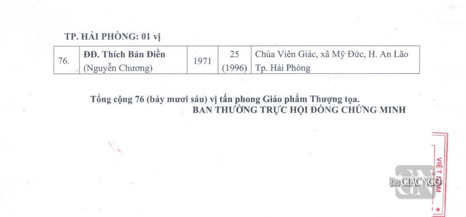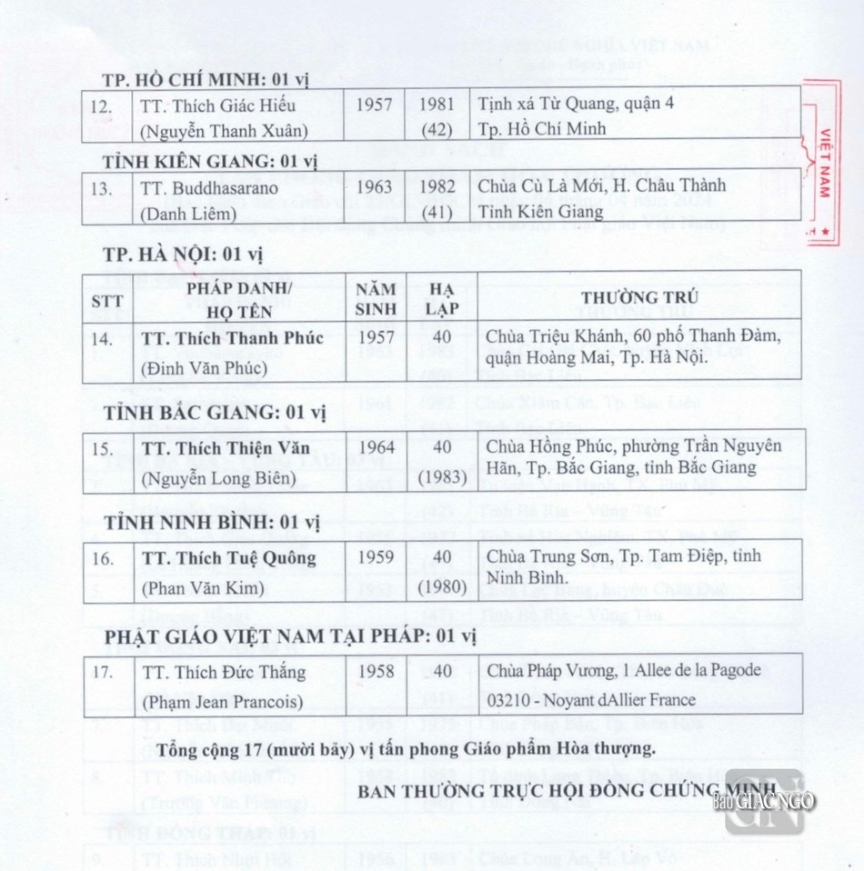 Cụ thể: Tấn phong 17 vị Thượng tọa lên giáo phẩm Hòa thượng; 76 Đại đức lên giáo phẩm Thượng tọa; 25 Ni sư lên giáo phẩm Ni trưởng; 199 Sư cô lên giáo phẩm Ni sư.