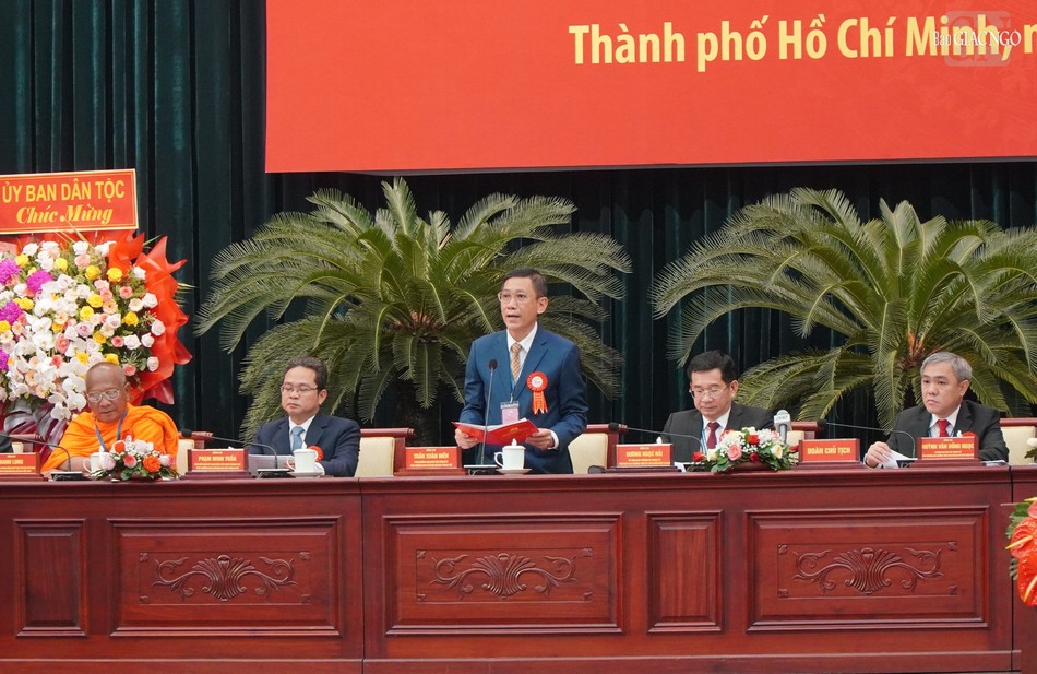 Ông Văn Hồng Ngọc, Trưởng ban Dân tộc TP.HCM, Phó Trưởng ban Thường trực Ban Chỉ đạo, Trưởng ban Tổ chức đại hội trình bày tóm tắt báo cáo chính trị Đại hội đại biểu các dân tộc thiểu số TP.HCM lần thứ IV năm 2024 |