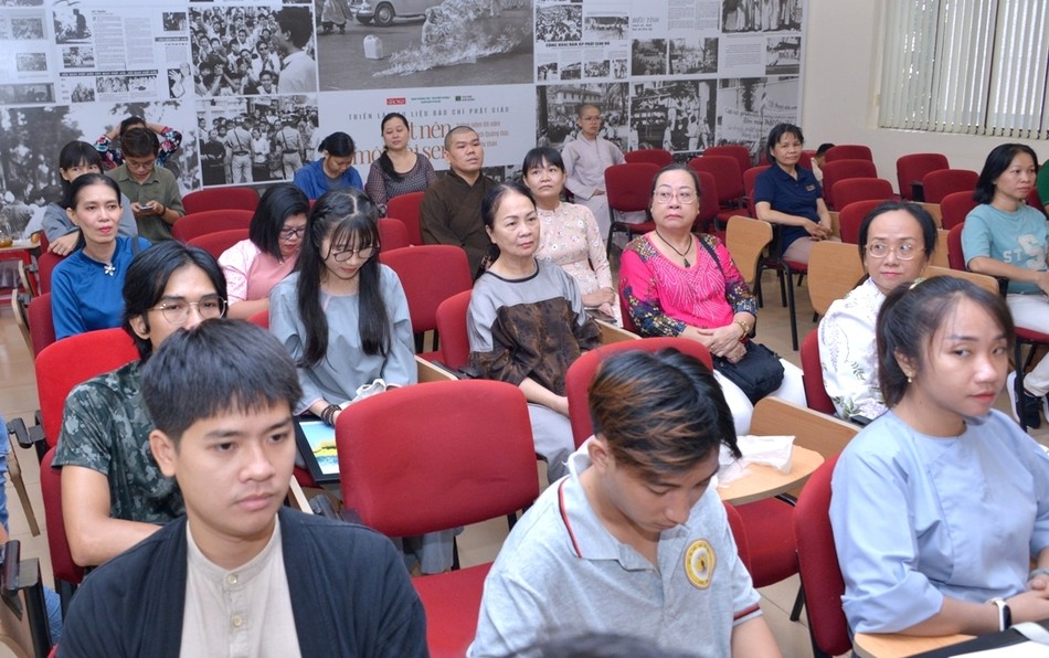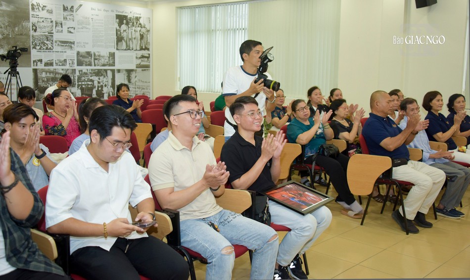 Hội trường xúc động khi Phật tử Hoa Minh chia sẻ về niềm hạnh phúc giản đơn của đội ngũ cộng tác viên - Phật tử đạo tràng Pháp Hoa, mỗi tuần chỉ trông chờ đến ngày thứ Năm để lên tòa soạn gói báo, gửi cho độc giả các tỉnh thành. "Thời gian làm việc từ 5 giờ 30 tới 8 giờ sáng nhưng đó là khoảng thời gian quý giá, nhiều ý nghĩa với anh, chị em chúng con", Phật tử Hoa Minh bộc bạch.