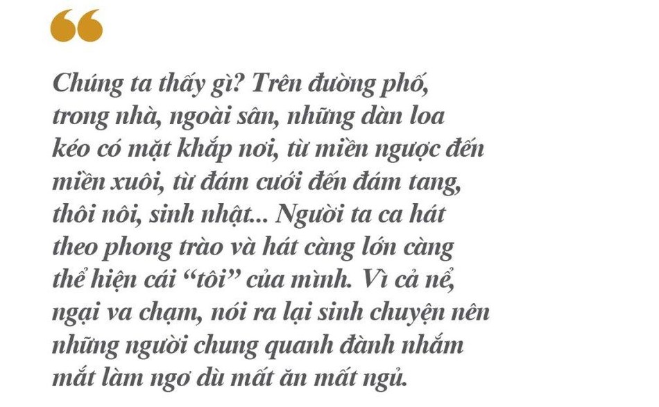 Chúng ta thấy gì? Trên đường phố, trong nhà, ngoài sân, những dàn loa kéo có mặt khắp nơi, từ miền ngược đến miền xuôi, từ đám cưới đến đám tang, thôi nôi, sinh nhật... Người ta ca hát theo phong trào và hát càng lớn càng thể hiện cái “tôi” của mình. Vì cả nể, ngại va chạm, nói ra lại sinh chuyện nên những người chung quanh đành nhắm mắt làm ngơ dù mất ăn mất ngủ. Một nhà có đám, cả xóm thức. Nên nhớ tiếng ồn dù ở ngưỡng cho phép, trong giờ quy định vẫn gây phiền toái đến người xung quanh. Thực tế cho thấy tiếng ồn tuy dễ nhận ra nhưng lại khó xử!
