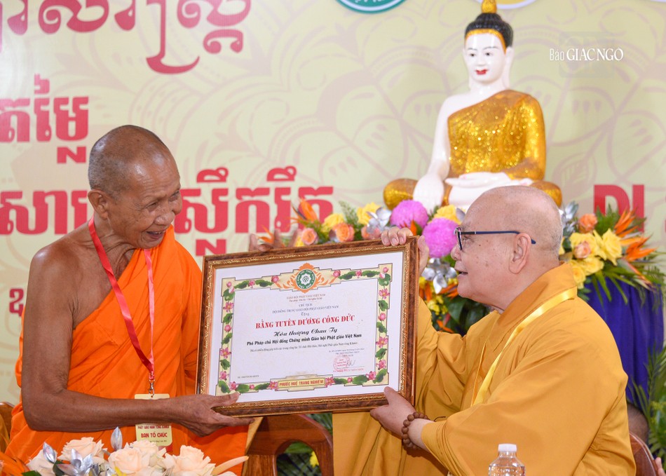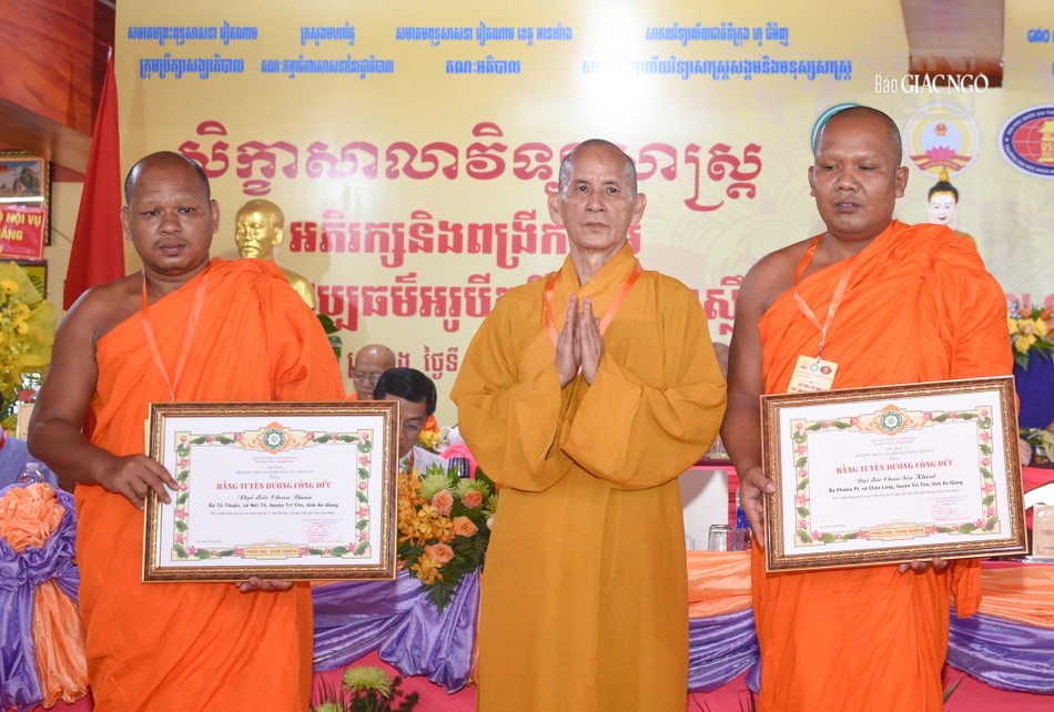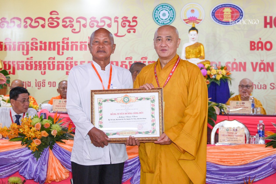Tiếp đó, Thượng tọa Thích Phước Nguyên, Phó Tổng Thư ký, Chánh Văn phòng II TƯ tuyên đọc quyết định tặng Bằng Tuyên dương công đức của Hội đồng Trị sự GHPGVN đến 6 cá nhân đã có nhiều đóng góp tích cực trong công tác tổ chức Hội thảo "Bảo tồn và phát huy giá trị văn hóa phi vật thể kinh lá buông" và Hội nghị đánh giá 19 năm thực hiện công tác hỗ trợ Phật giáo Nam tông Khmer.