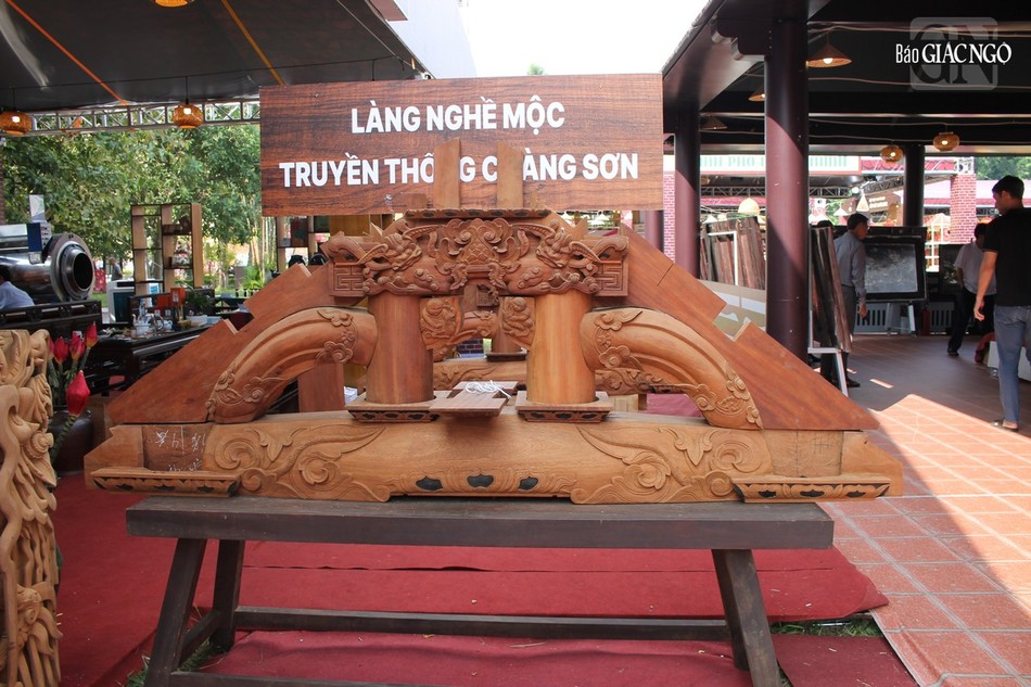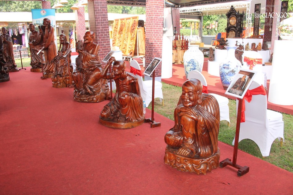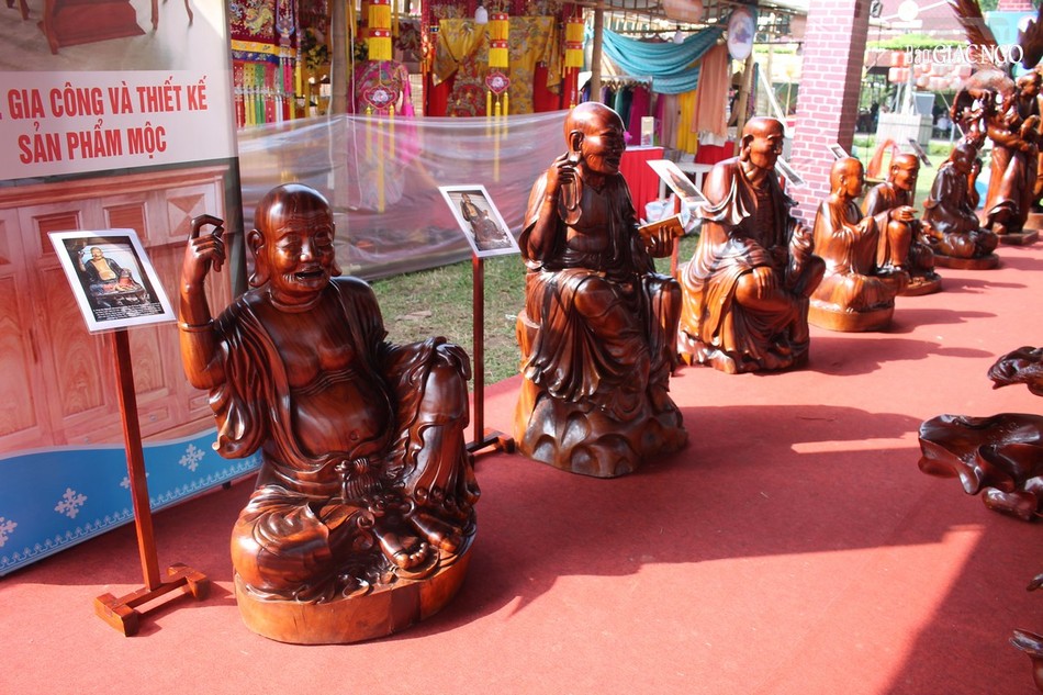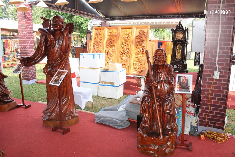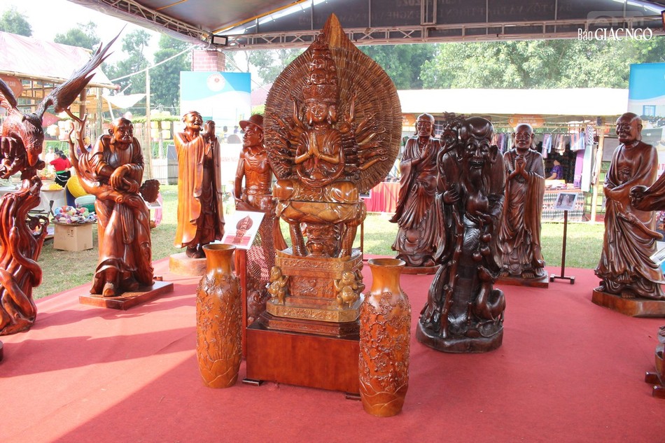 Đặc biệt, tại các gian hàng sản phẩm nghề mộc - đồ gỗ có rất nhiều pho tượng Phật, Bồ-tát, La-hán được chế tác vô cùng tinh xảo.