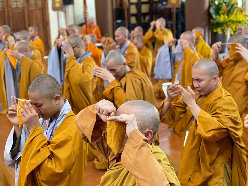 GNO - Sau lễ khai mạc vào sáng 5-10 (10-9-Nhâm Dần), Hội đồng Thập sư nhị bộ Tăng, Ni đã tấn đàn truyền giới cho giới tử tại hai giới trường chùa Long Sơn và Ni viện Diệu Quang.