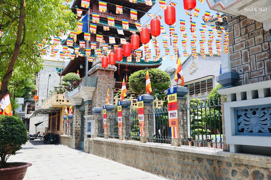 | Cờ Phật giáo được treo rợp khắp sân chùa và trên đường Bà Huyện Thanh Quan (Q.3) |