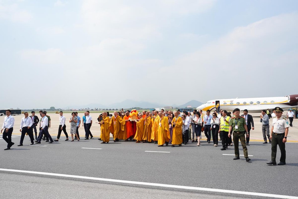 Cung đón xá-lợi Đức Phật tại sân bay Nội Bài có Trưởng lão Hòa thượng Thích Thanh Nhiễu, Ủy viên Thường trực Hội đồng Chứng minh, Phó Chủ tịch Thường trực Hội đồng Trị sự; Hòa thượng Thích Bảo Nghiêm, Phó Chủ tịch Hội đồng Trị sự, Trưởng ban Hoằng pháp T.Ư, Trưởng ban Trị sự GHPGVN TP.Hà Nội; Thượng tọa Thích Đức Thiện, Phó Chủ tịch kiêm Tổng Thư ký Hội đồng Trị sự; cùng chư vị giáo phẩm Hội đồng Trị sự GHPGVN; Thứ trưởng Bộ Dân tộc và Tôn giáo Nguyễn Hải Trung; ông Lê Hồng Sơn, Ủy viên Ban Thường vụ Thành ủy, Phó Chủ tịch Thường trực UBND TP.Hà Nội; cùng đại diện các ban ngành Trung ương, TP.Hà Nội và đông đảo Tăng Ni, Phật tử, người dân Thủ đô.