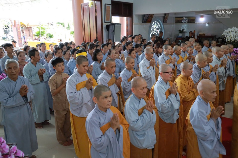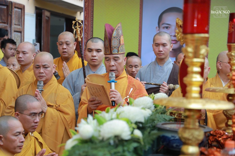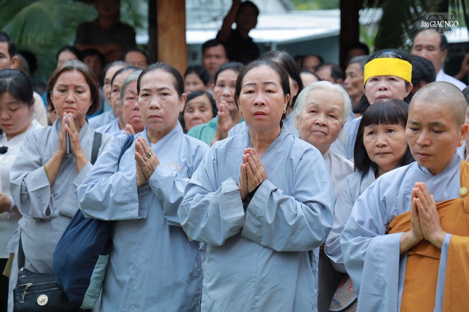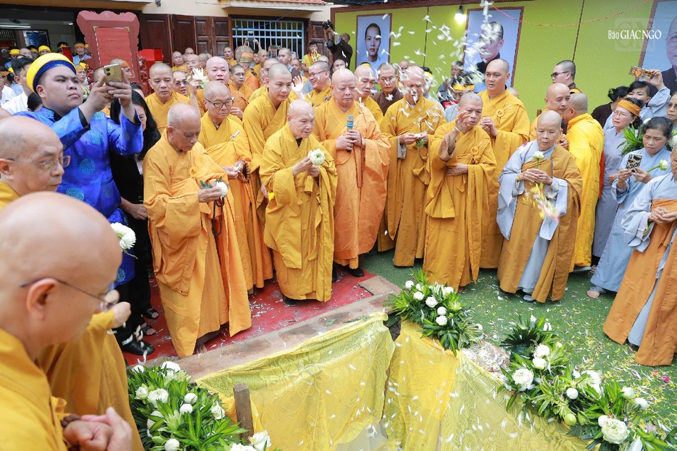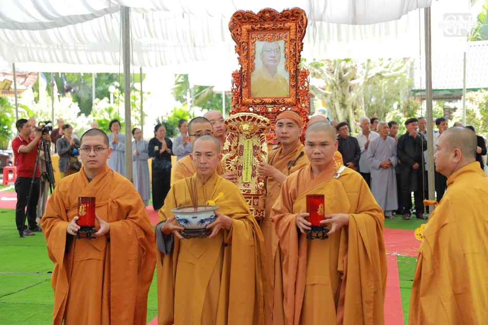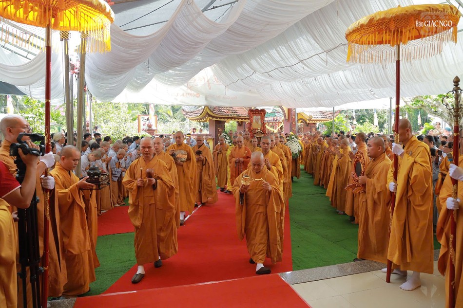 Chư tôn đức cử hành lễ cung thỉnh kim quan Trưởng lão Hòa thượng Thích Thiện Tánh nhập bảo tháp tại chùa Long Phú - Ảnh: Tâm Quý