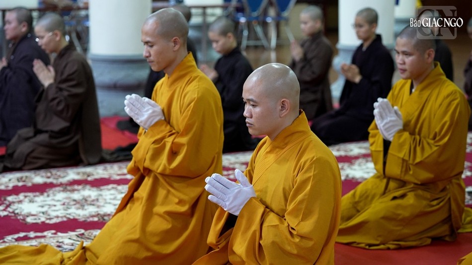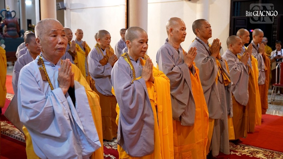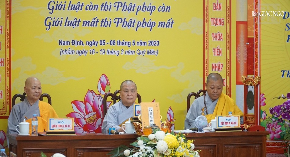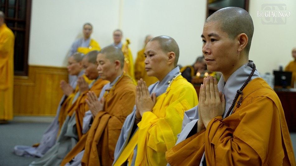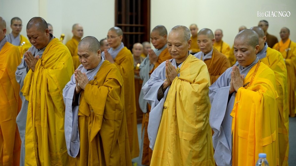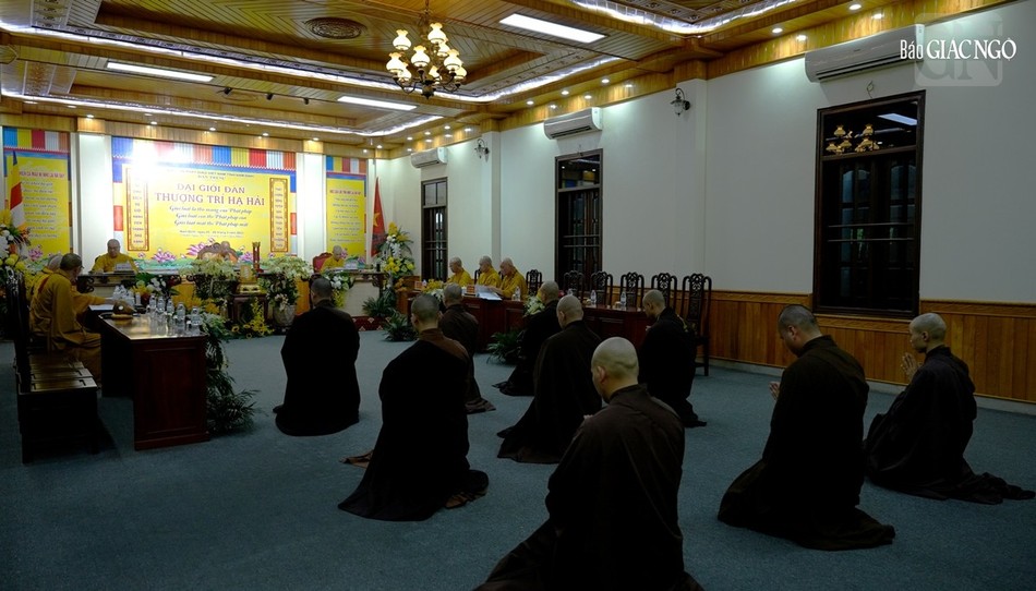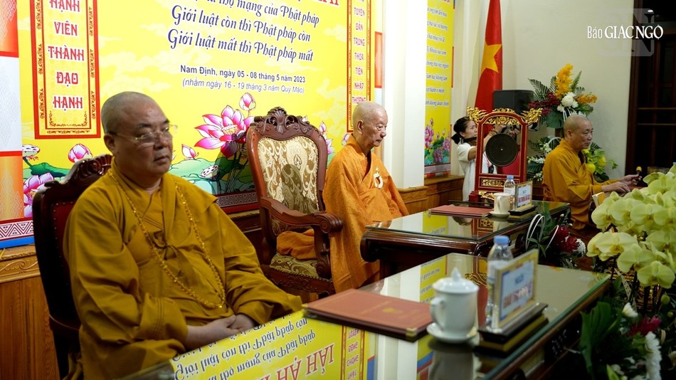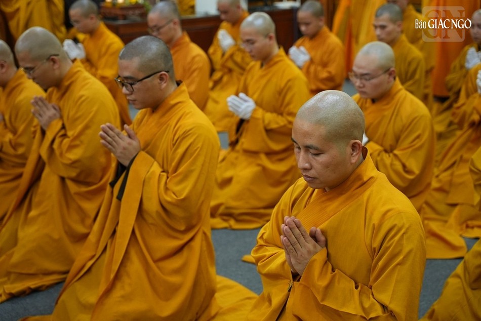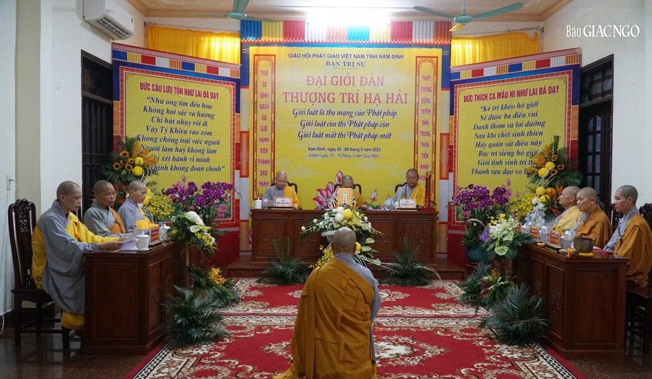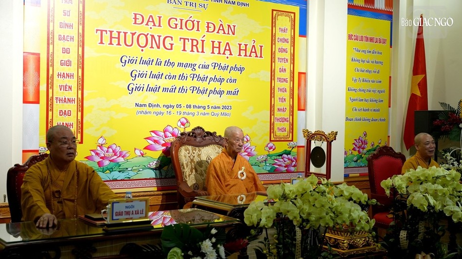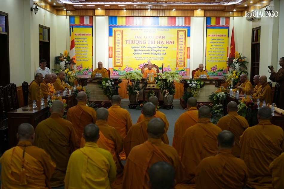 | Hội đồng Giới sư Tăng, Ni, các nghiệp sư, giới tử Đại giới đàn Trí Hải Phật lịch 2566 (2023) do Ban Trị sự GHPGVN tỉnh Nam Định tổ chức ở Trung tâm Phật giáo Trúc Lâm Thiên Trường - Ảnh: Tuấn Anh/BGN |