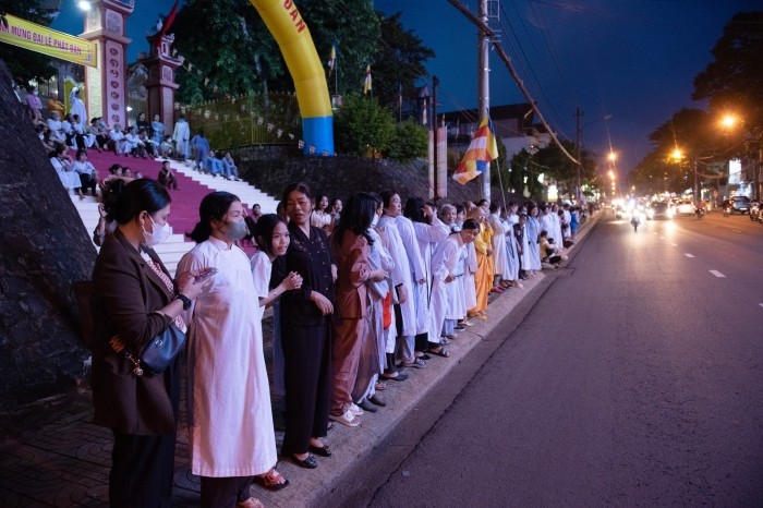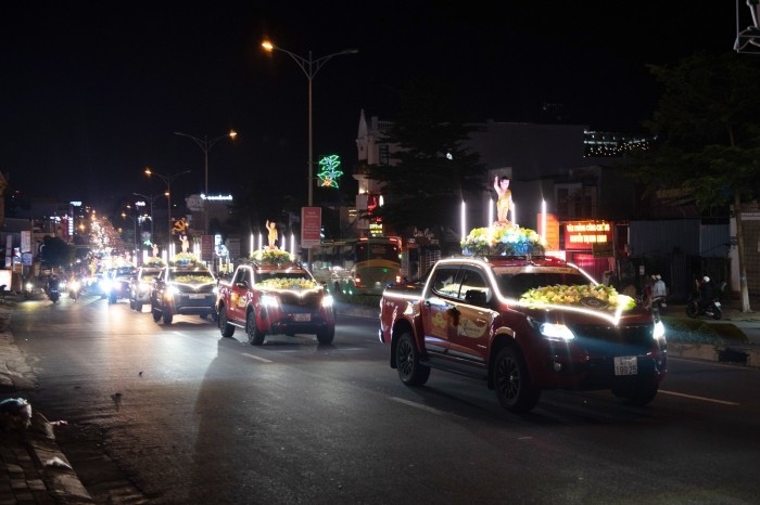 Đoàn diễu hành gồm xe hội mô tô Đắk Lắk, xe hoa tiêu, tiếp đến xe Ban Tổ chức, xe rước chư tôn đức, xe đoàn lân sư rồng của Gia đình Phật tử Khải Đoan và xe máy Phật tử tháp tùng.