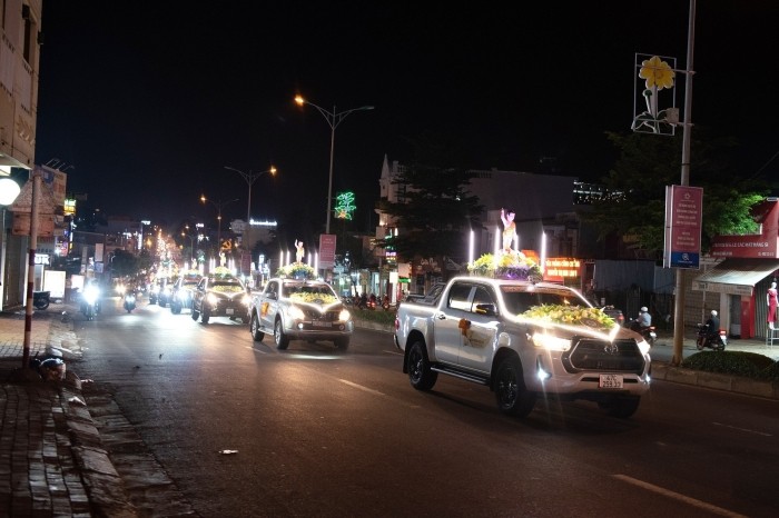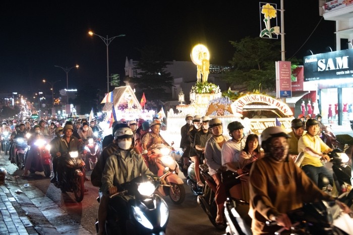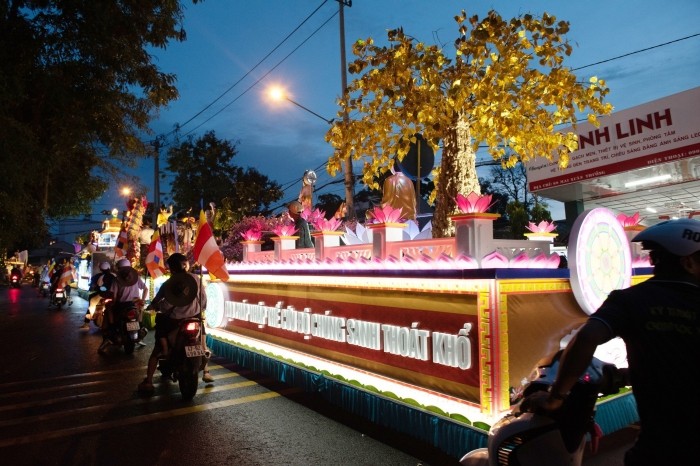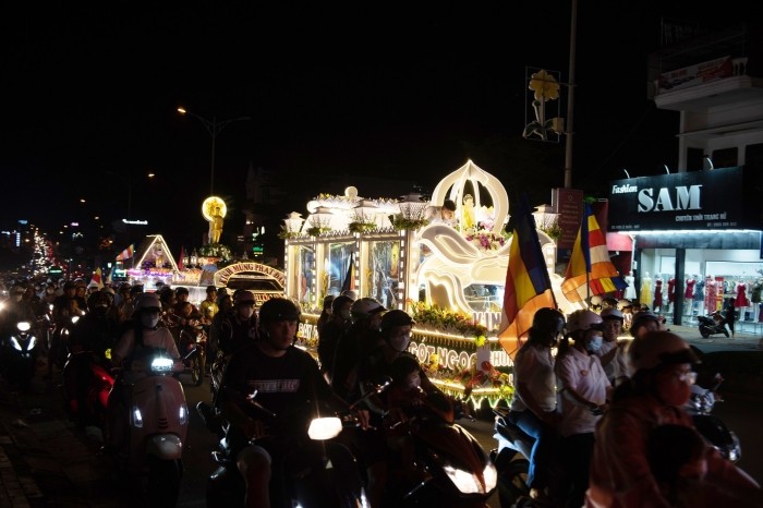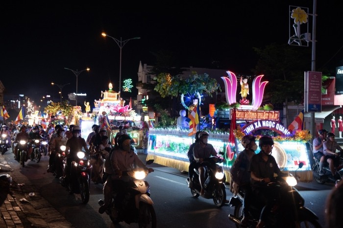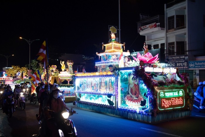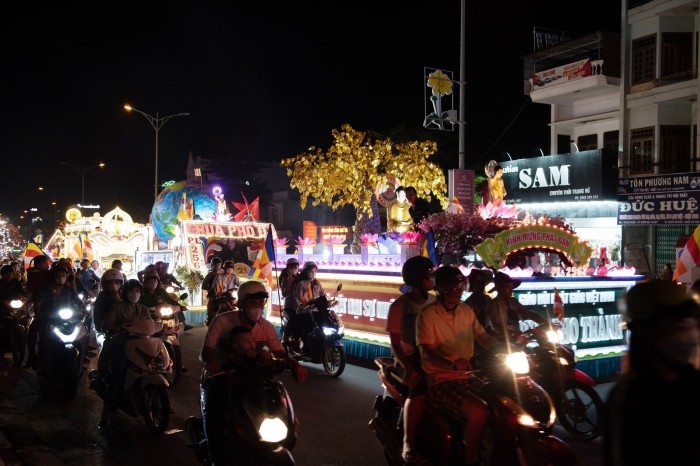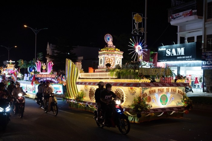 Đoàn diễu hành xe hoa có 24 xe, trong đó có 9 xe hoa đến từ các tự viện: Khải Đoan, tịnh xá Ngọc Quang, tịnh xá Ngọc Thành, A Dục, Thọ Thành, Phổ Đà, Hải Triều Âm, Phước Hòa, Lộc Uyển và 15 xe hoa do Giáo hội Thành phố đảm trách.