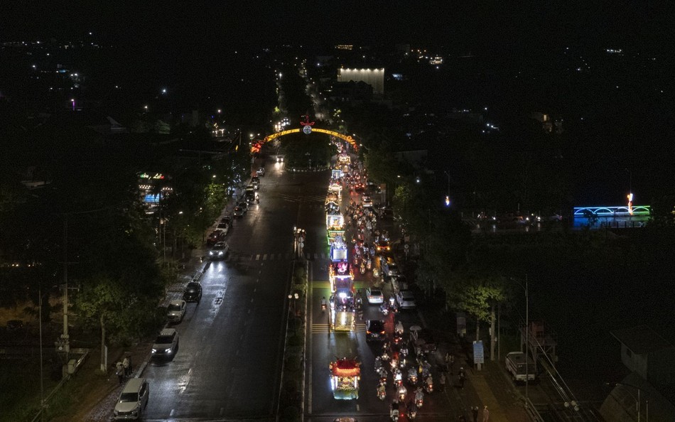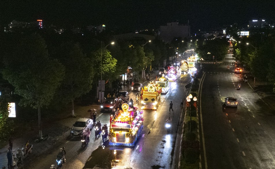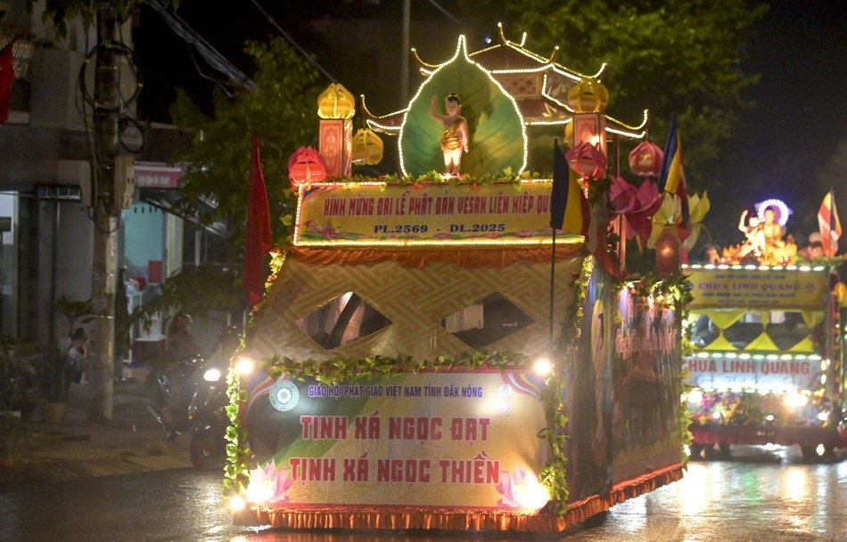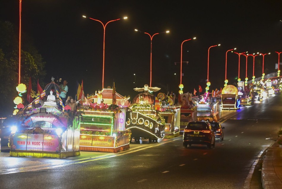 Đoàn xe hoa khởi hành tại chùa Pháp Hoa và diễu hành trên các trục lộ chính của TP.Gia Nghĩa. Những chiếc xe hoa nối đuôi nhau thành đoàn dài thu hút đông đảo bà con Phật tử và người dân hưởng ứng theo dõi.