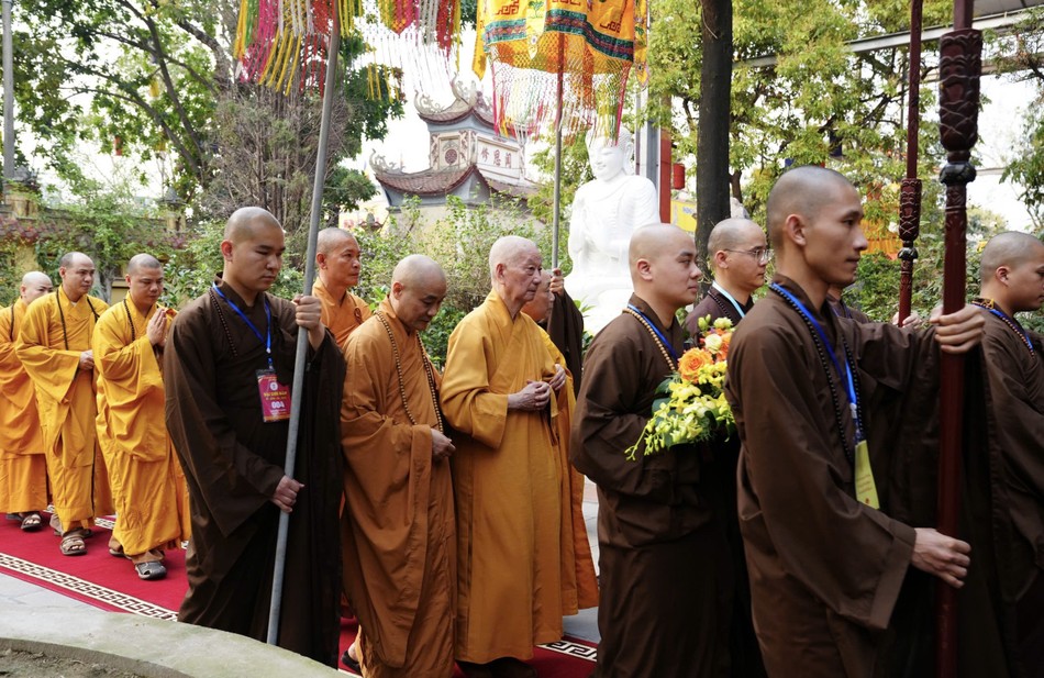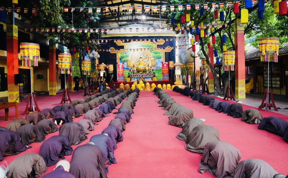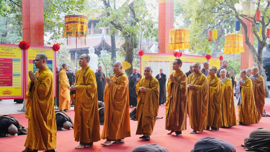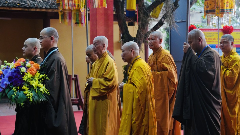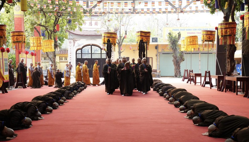 Sau khi cung nghinh Đức Pháp chủ an tọa nơi lễ đường, Hòa thượng Thích Bảo Nghiêm, Phó Chủ tịch Hội đồng Trị sự, Trưởng ban Trị sự GHPGVN TP.Hà Nội, Trưởng ban Kiến đàn cùng chư tôn đức Ban Kiến đàn, Ban Trị sự, giới sư Tăng Ni và đại diện các nghiệp sư đã vân tập bái chào theo nghi thức truyền thống thiền môn miền Bắc.
