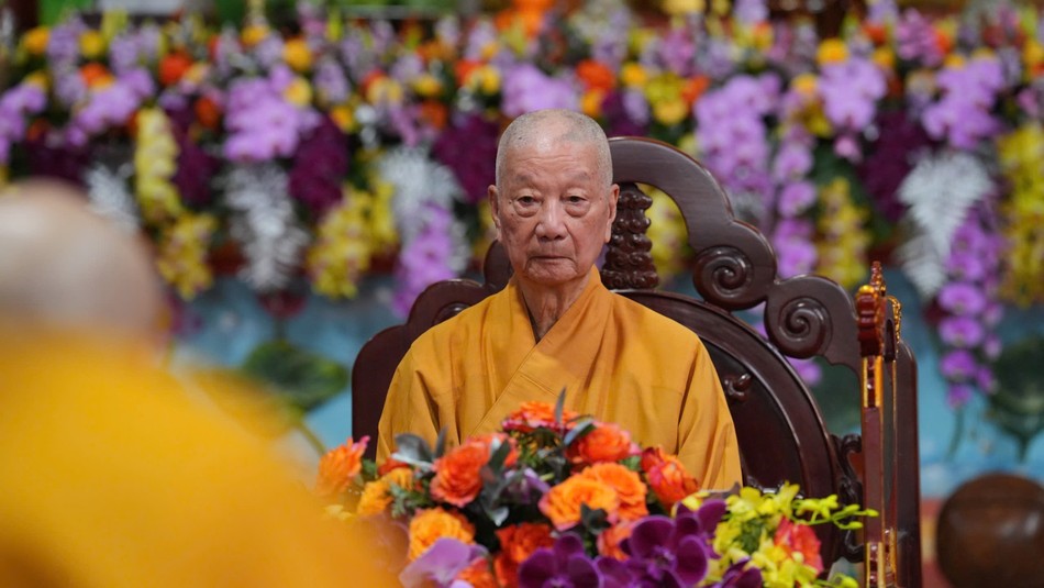 Hòa thượng Trưởng ban Kiến đàn tác bạch, hướng dẫn giới tử đảnh lễ Đức Pháp chủ GHPGVN.