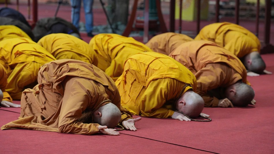 Ban Trị sự, Ban Kiến đàn, giới sư, nghiệp sư và giới tử Đại giới đàn TP.Hà Nội bái chào Đức Pháp chủ theo truyền thống thiền môn miền Bắc |