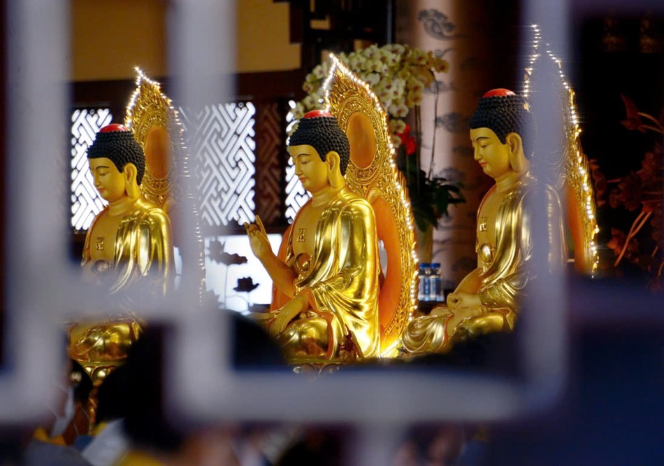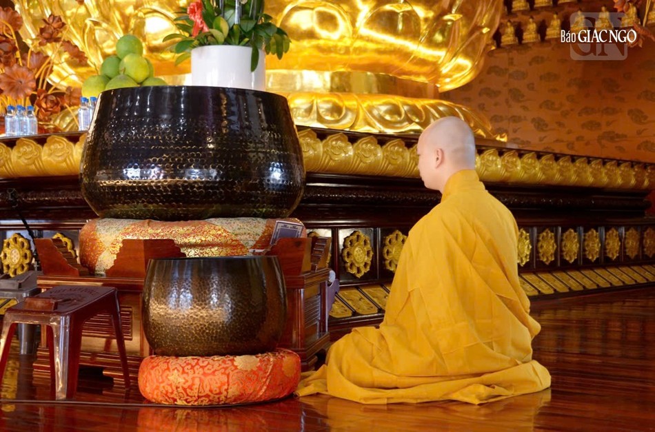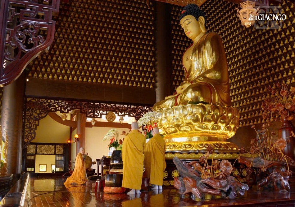Đại lão Hòa thượng phương trượng chùa quang lâm niêm hương bạch Phật, trực tiếp hướng dẫn nghi thức sám hối và phát nguyện cho người mới phát tâm.