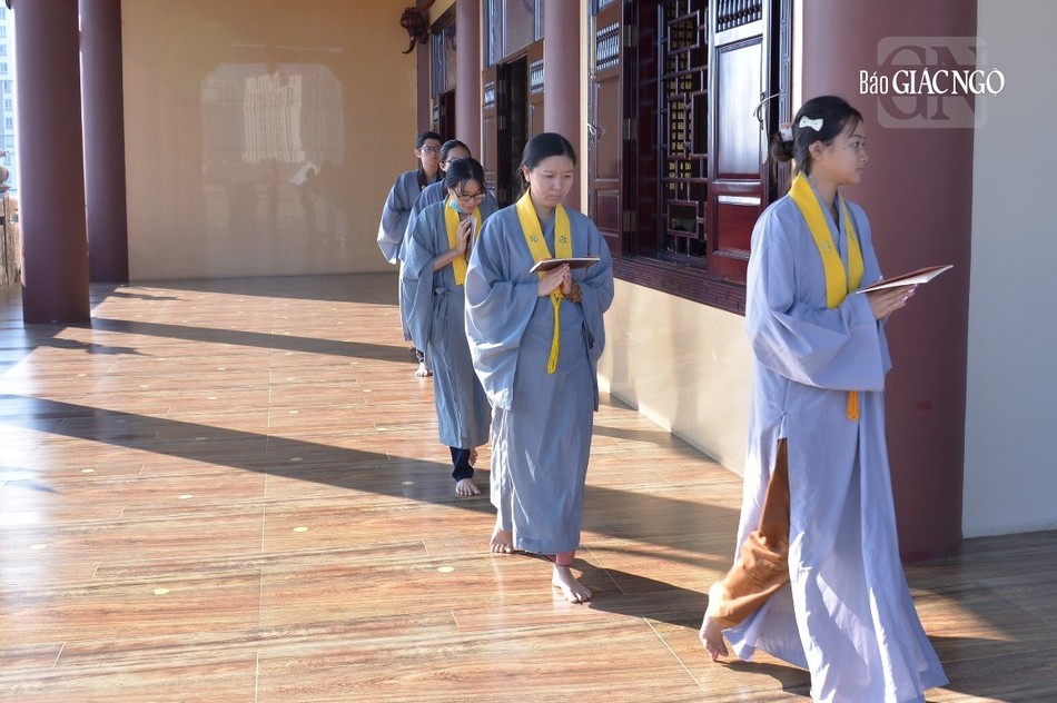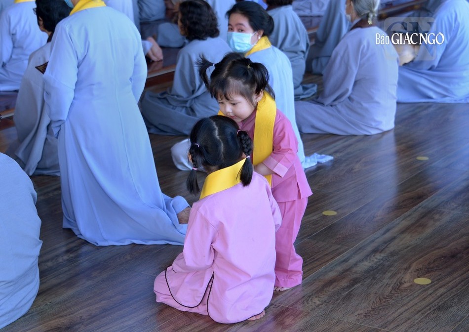 Sau khi được hướng dẫn về oai nghi căn bản của người Phật tử, tại chánh điện chùa Huê Nghiêm, Đại lão Hoà thượng Thích Trí Quảng, viện chủ chùa Huê Nghiêm quang lâm niêm hương bạch Phật, hướng dẫn người phát tâm sám hối và phát nguyện quy y ba ngôi báu là Phật, Pháp và Tăng bảo.