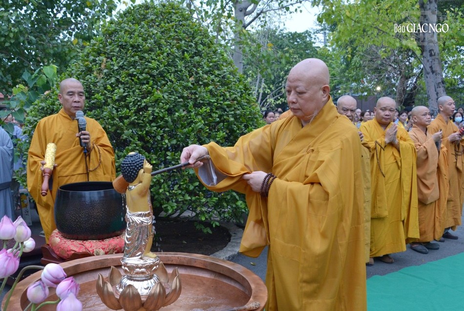 Đại lão Hòa thượng Thích Trí Quảng, phương trượng chùa Huê Nghiêm đã thân lâm niêm hương, cử hành lễ Tắm Phật.