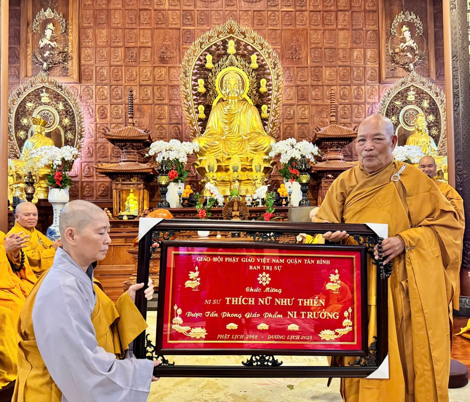 Dịp này, Ban Trị sự cũng đã trao khánh vàng chúc mừng đến chư tôn đức Tăng Ni được tấn phong giáo phẩm trong Nghị quyết số 25/NQ-HĐCM vừa qua của Ban Thường trực Hội đồng Chứng minh GHPGVN