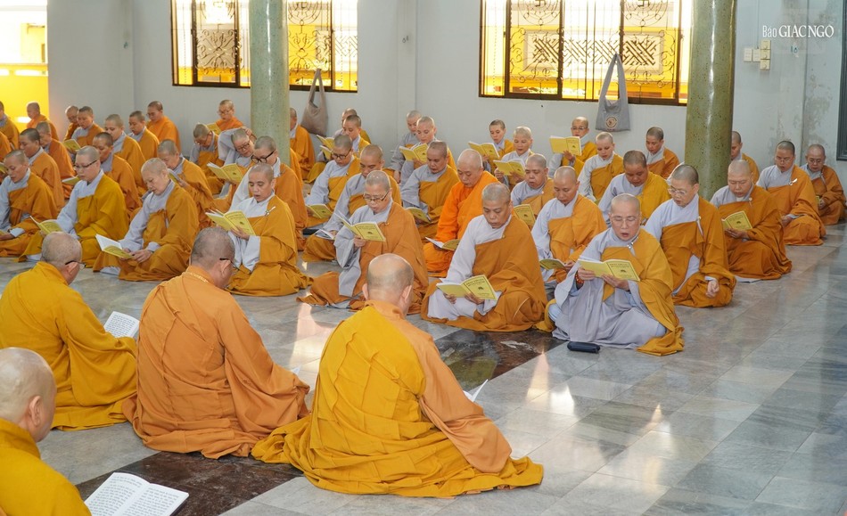 Sau khi thính pháp, chư Tăng Ni vân tập chánh điện thực hiện thời khóa tụng kinh |