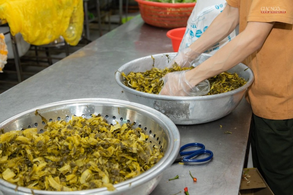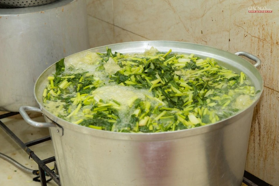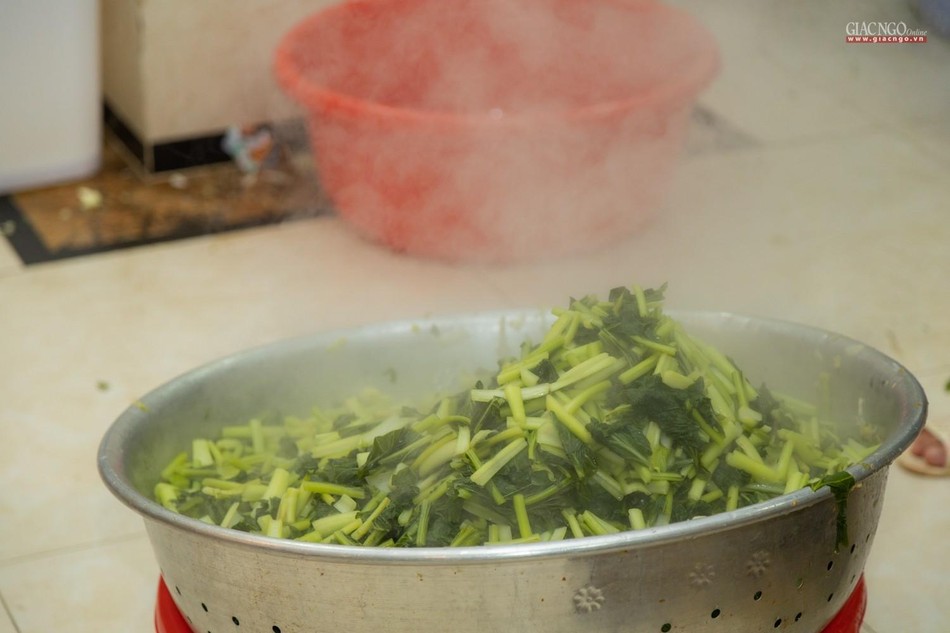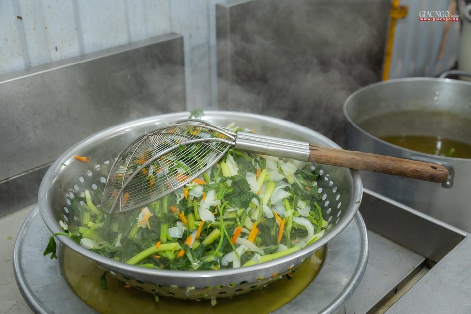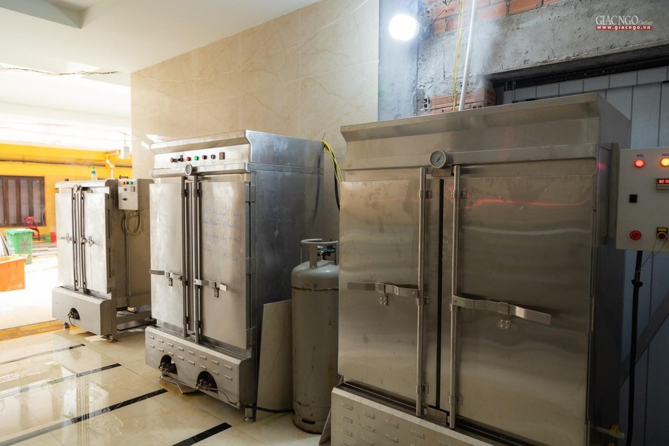 Dựa trên số lượng nguyên liệu, rau củ tiếp nhận hàng ngày, người phụ trách chính của các khâu sẽ tính toán phân phối thực đơn phù hợp. Bếp ăn sử dụng khoảng 1,2 tấn gạo mỗi ngày.