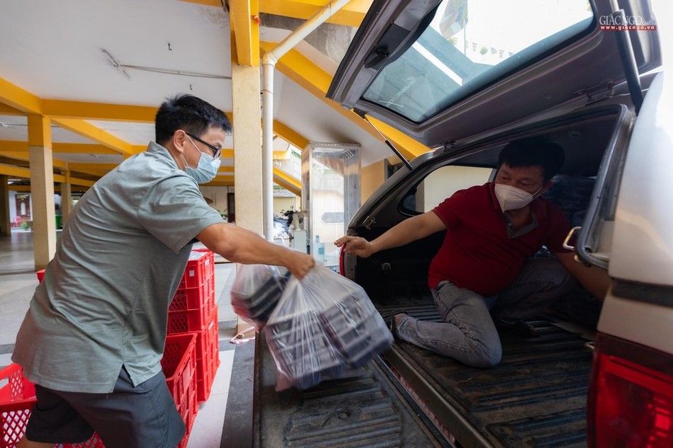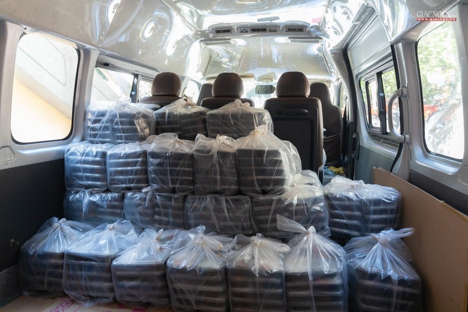 Riêng đội xe với khoảng 15 người giao nhận suất ăn được chia theo hai khung giờ cố định trong ngày. Buổi sáng, các suất ăn sẽ được chuyển lên xe từ 9g30 đến 11g. Các xe giao cơm đến các điểm tiếp nhận, bệnh viện điều trị Covid-19 ở xa sẽ được ưu tiên nhận trước. Buổi chiều, việc giao cơm bắt đầu từ 15g30 đến 15g45 và hoàn tất vào 17g. Riêng với các bệnh viện dã chiến, khu điều trị Covid-19, việc giao nhận phải đảm bảo các suất ăn đến đúng giờ nghỉ của y bác sĩ cũng như giờ ăn của bệnh nhân.