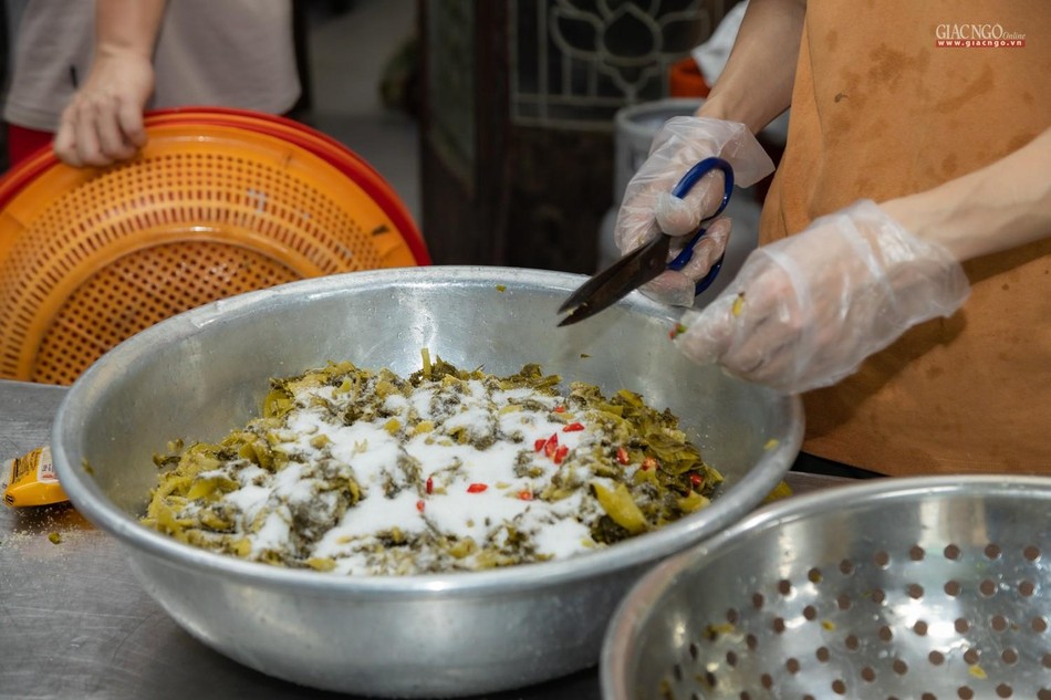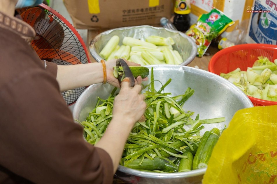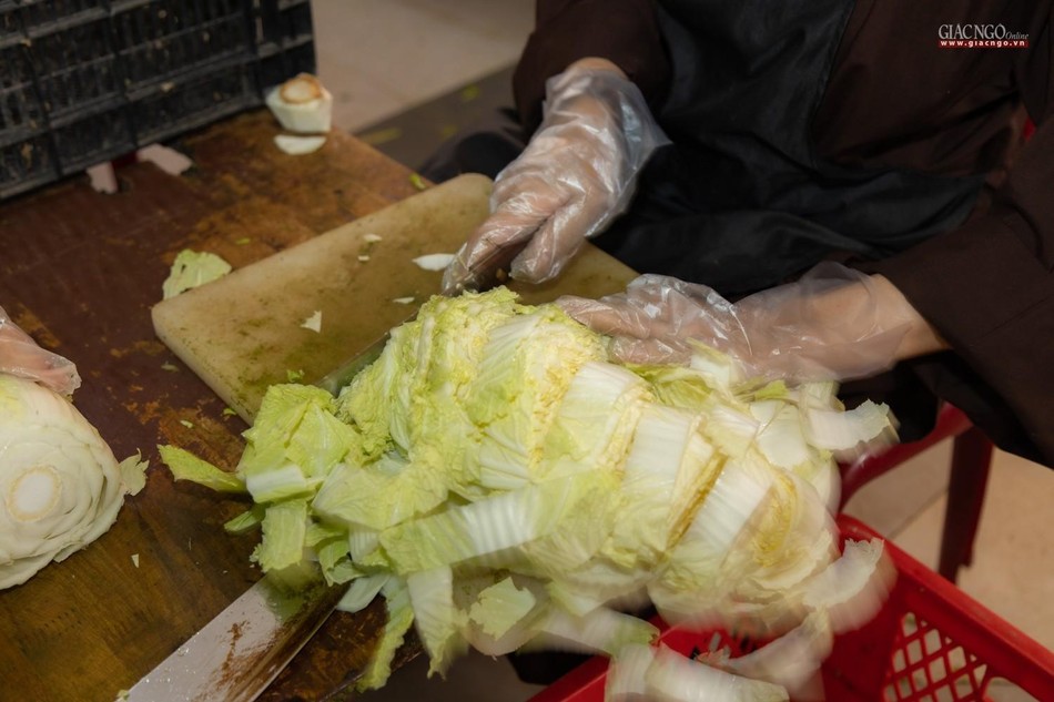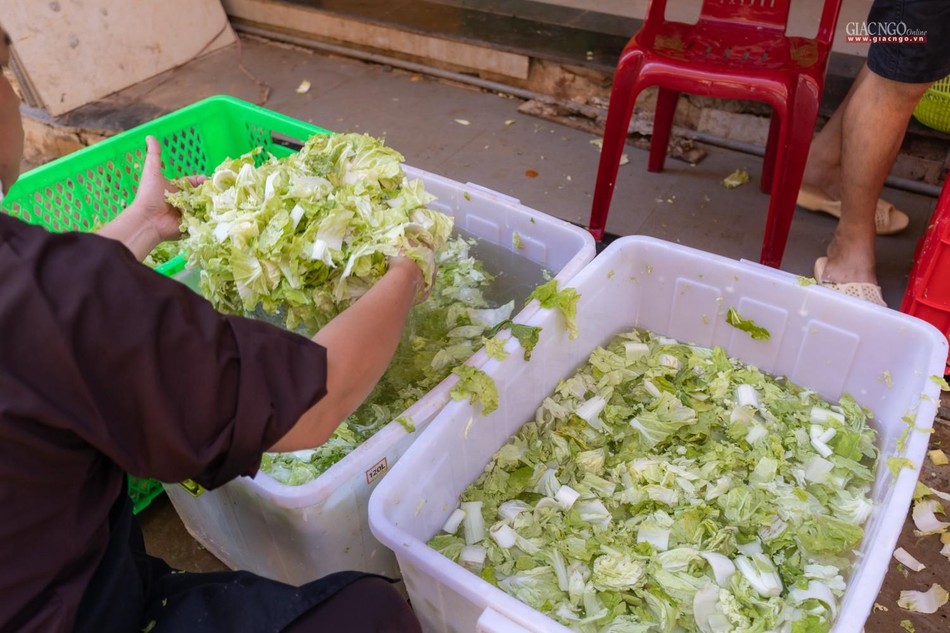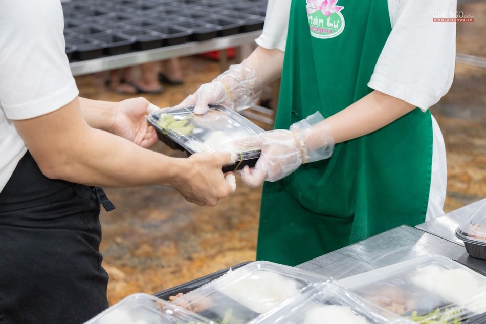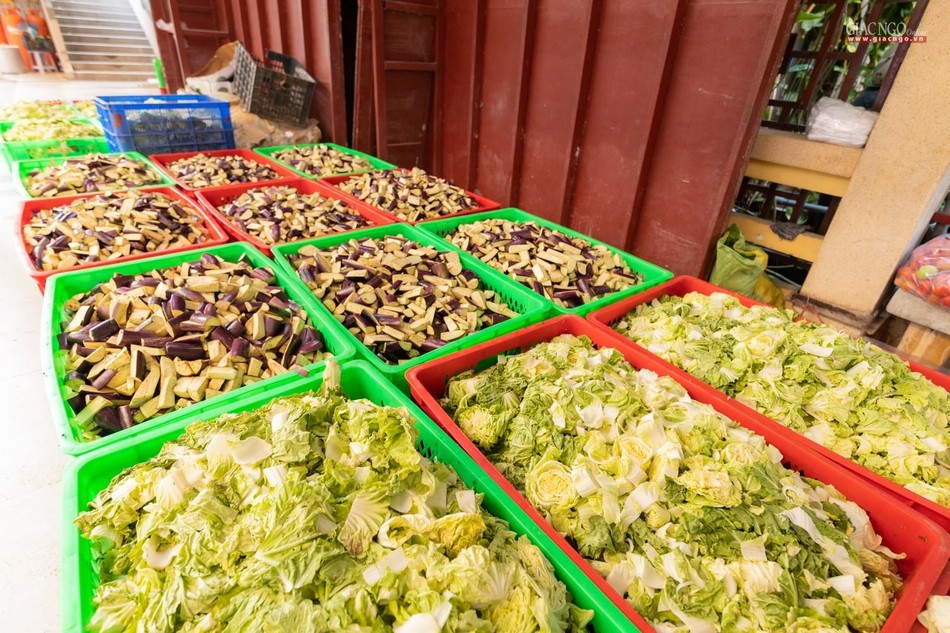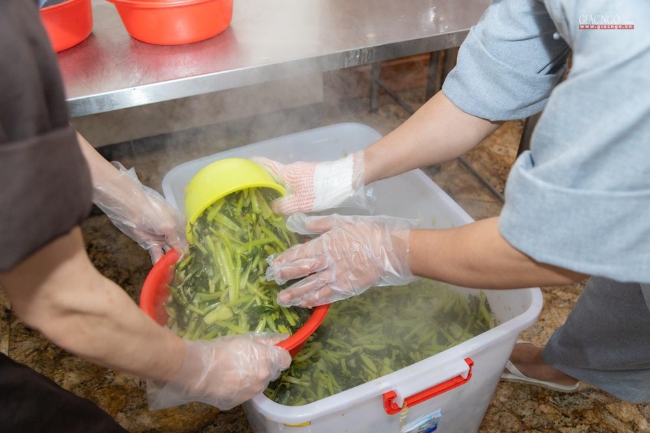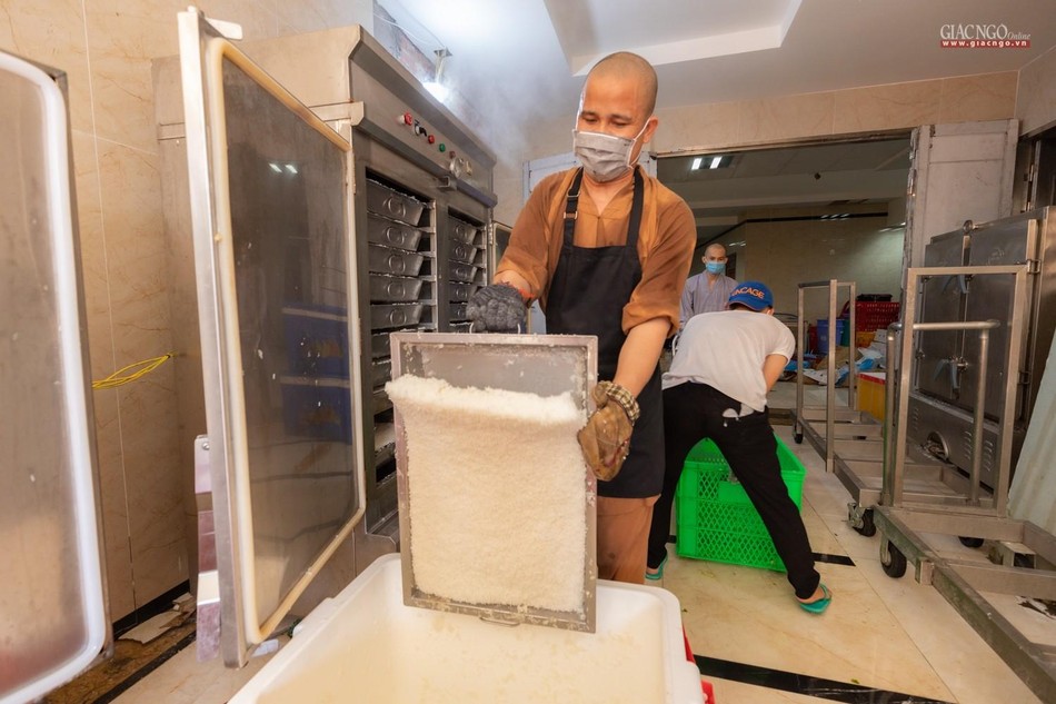 Hàng ngày, các công việc chính tại bếp ăn thiện nguyện chùa Vĩnh Nghiêm được thực hiện bởi chư Tăng gồm 90 vị và gần 150 Phật tử, tình nguyện viên. Phật tử, tình nguyện viên tham gia phục vụ bếp ăn được bố trí nơi ăn ngủ tại chỗ và được kiểm tra sức khỏe, test nhanh định kỳ. Nhân sự được phân công cụ thể theo từng khâu cắt gọt, nấu nướng, đóng hộp,… nhằm đảm bảo bếp ăn được hoạt động liên tục.