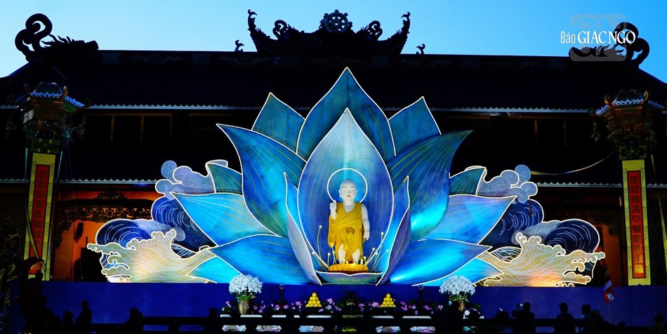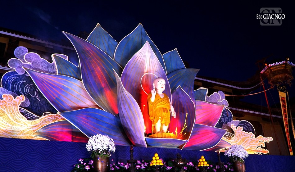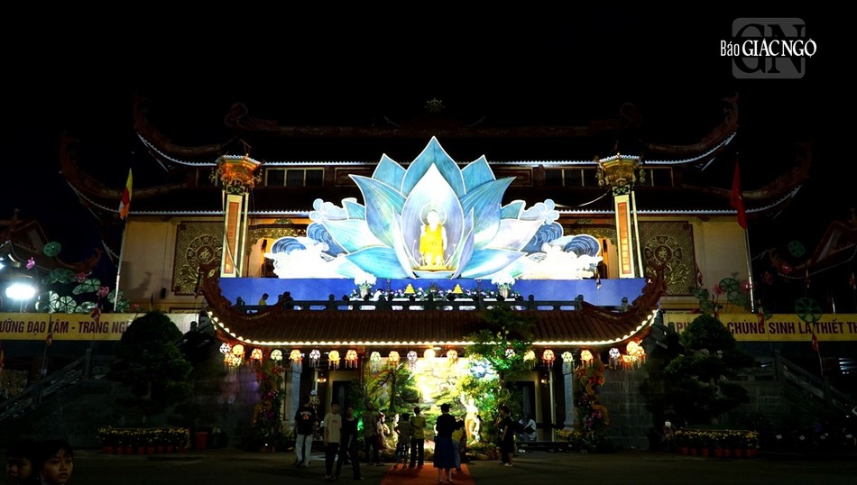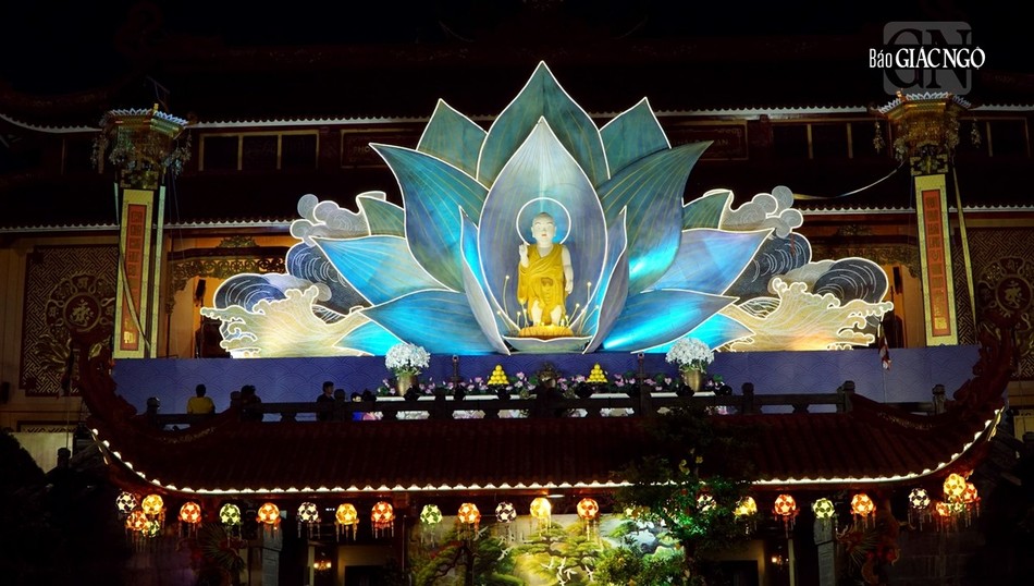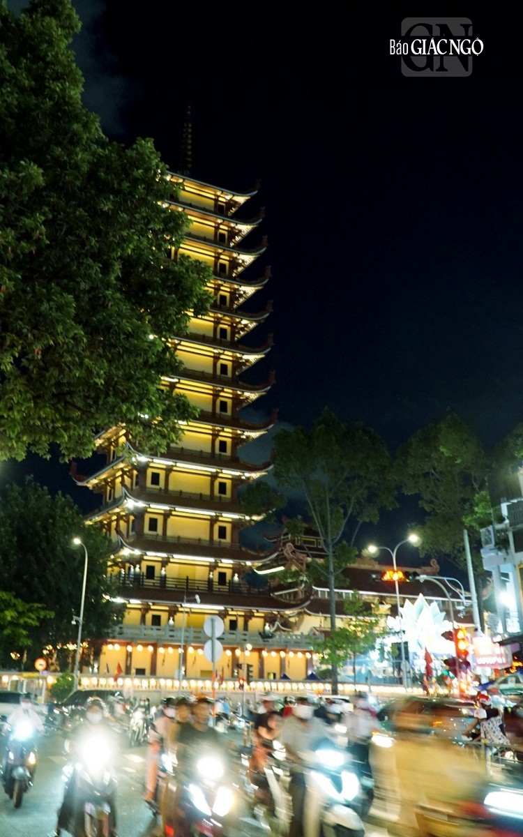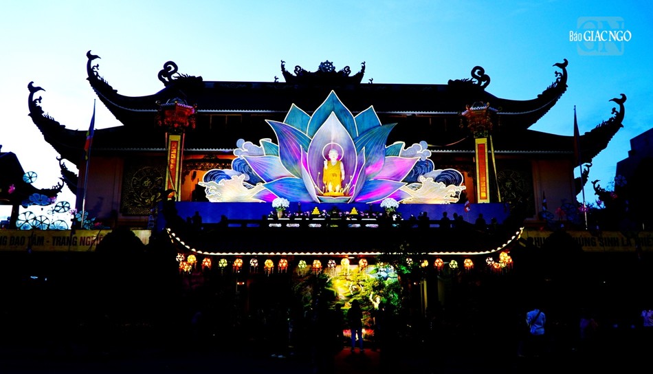 GNO - Sắc màu lung linh hiện lên trên nền trời đêm ở Việt Nam Quốc Tự - nơi lễ đài chính của Phật giáo TP.HCM trang nghiêm tôn trí Đức Phật sơ sinh ấn tượng bên trong hình tượng một đóa sen "khổng lồ" trở nên mầu nhiệm với sự biến chuyển nhiều sắc thái khác nhau tạo nên nét độc đáo riêng.