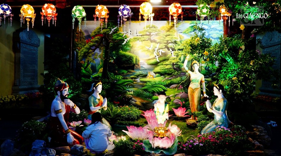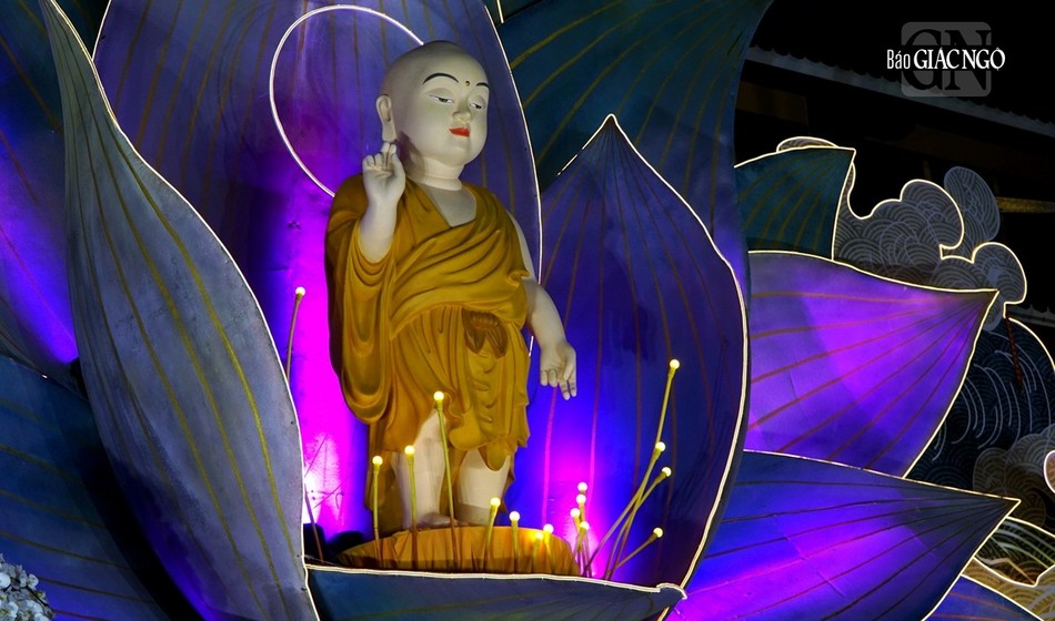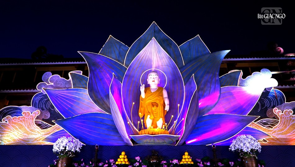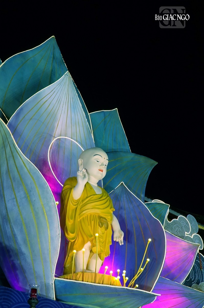 Bên thềm Đại lễ chính thức kính mừng kỷ niệm Đức Phật đản sinh, lễ đài chính của Phật giáo TP.HCM tại Việt Nam Quốc Tự, tôn trí tôn tượng Đức Phật sơ sinh bên trong hình tượng hoa sen ấn tượng với nhiều sắc màu uyển chuyển trong đêm tháng Tư.