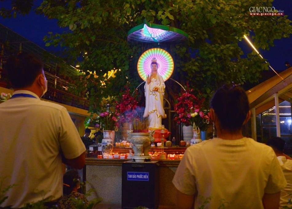 Thời tiết sáng rằm tháng Bảy tại TP.HCM nắng đẹp. Ngay từ rất sớm, vào khoảng 5 giờ sáng, nhiều Phật tử đã đến chùa Huê Nghiêm - TP.Thủ Đức tham dự thời tụng kinh sớm tại tượng đài Bồ-tát Quán Thế Âm.