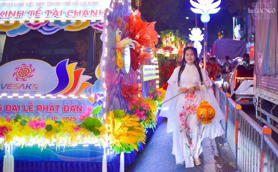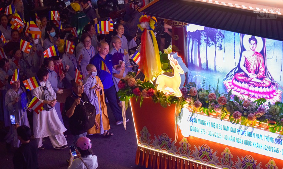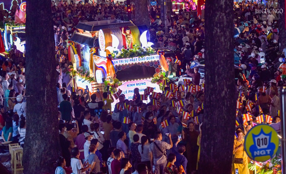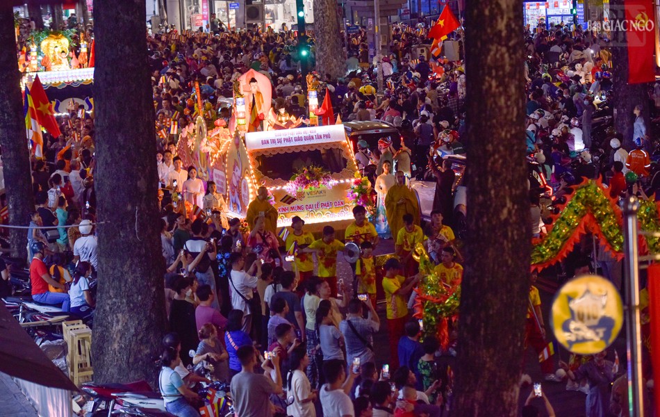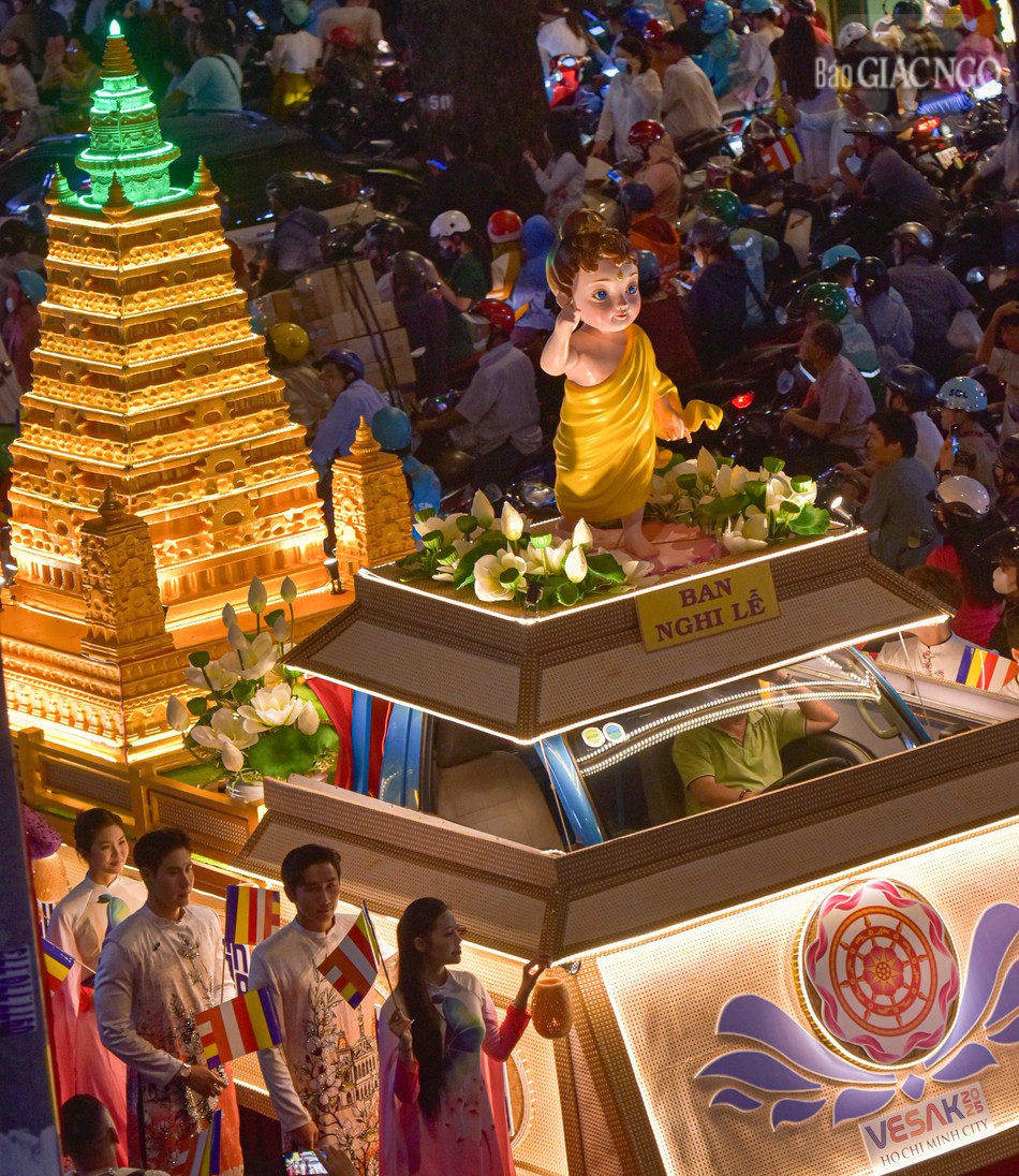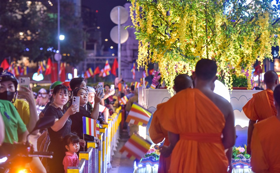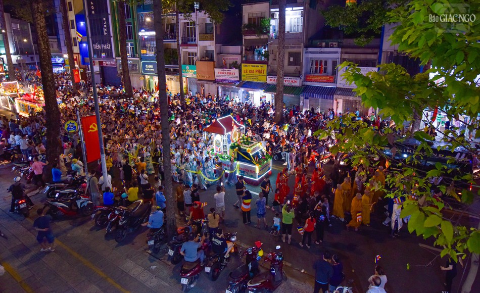 Theo lộ trình cung rước Đức Phật đản sinh từ đường Sư Vạn Hạnh (tổ đình Ấn Quang) - Ngô Gia Tự - đường Điện Biên Phủ - Cao Thắng - đường 3/2 - vào cổng chính Việt Nam Quốc Tự - nơi lễ đài chính của Phật giáo TP.HCM, đoàn xe hoa đã tạo nên dấu ấn riêng với sắc màu thiêng liêng của đêm tháng Tư khánh đản Đức Từ Phụ Thích Ca Mâu Ni. Sắc màu cùng hòa vào không khí thành kính, trang nghiêm, góp phần lan tỏa hình ảnh đẹp, truyền thông điệp từ bi, trí tuệ, bao dung, hòa bình đến cộng đồng của mùa Phật đản an lành trong mỗi trái tim người con Phật.
