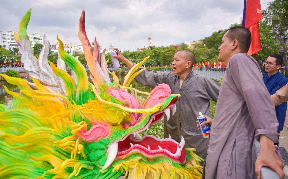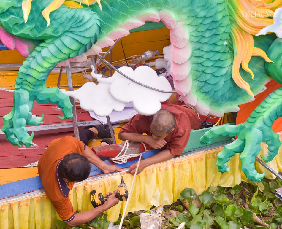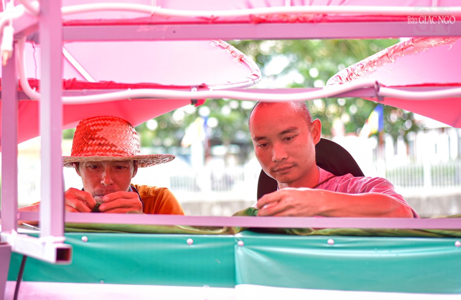Những ngày đầu tháng 4 Âm lịch, khắp mọi con đường bên dòng kênh Nhiêu Lộc tràn ngập cờ hoa đón mừng Phật đản. Giữa không gian đầy sắc màu ấy thấp thoáng những bóng áo nâu, lưng ướt đẫm mồ hôi đang cặm cụi tô tô vẽ vẽ, trang trí cho chiếc thuyền hoa đang neo đậu trước tổ đình Vạn Thọ (Q.1, TP.HCM) thêm phần rực rỡ.