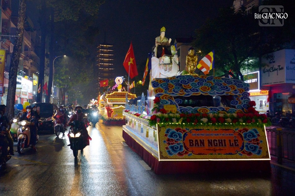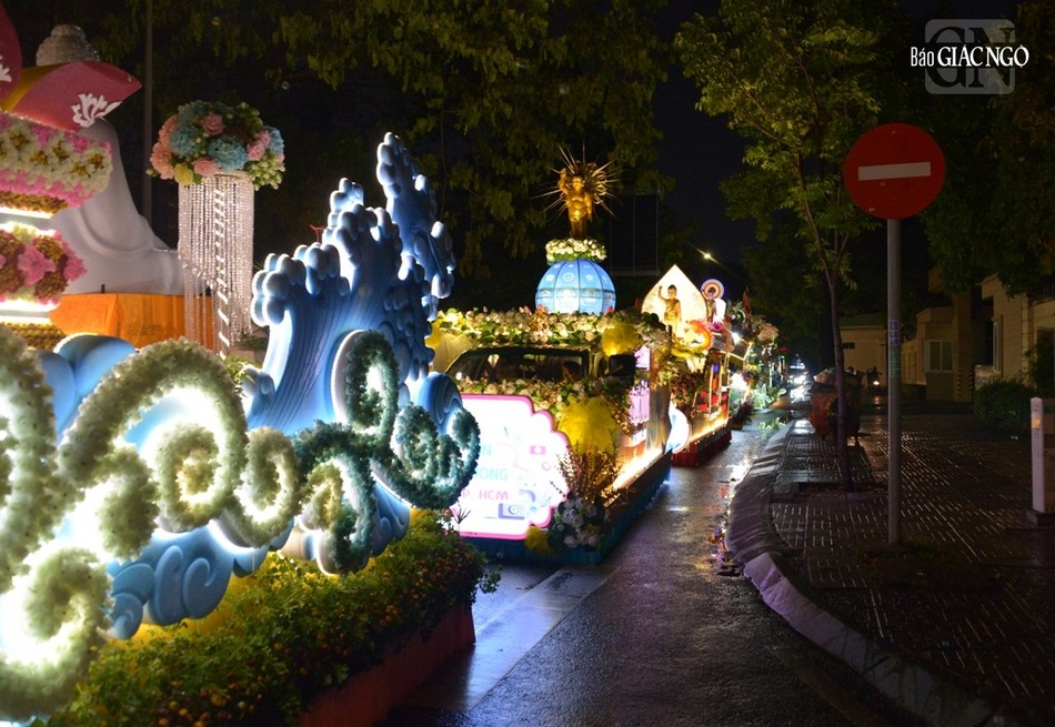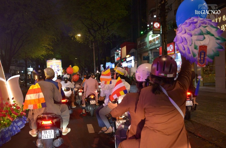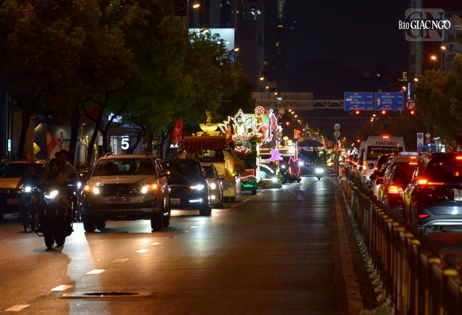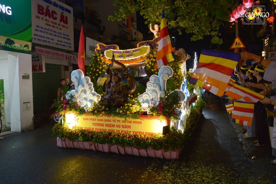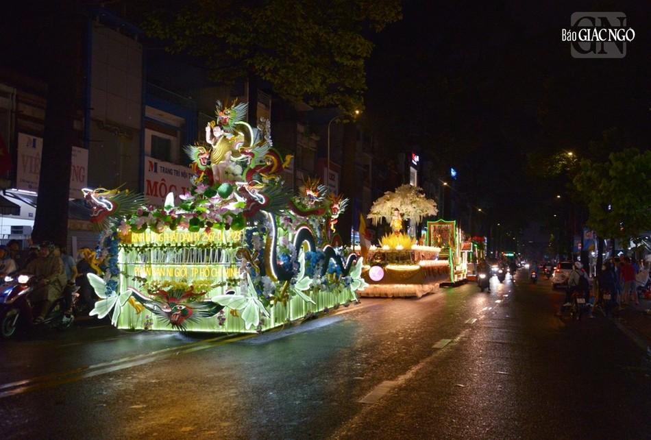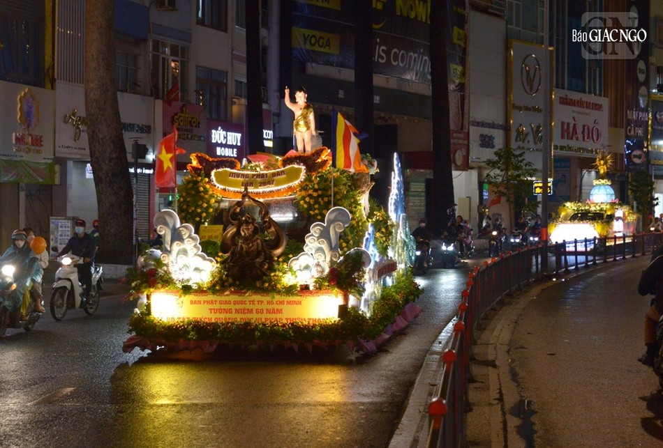 GNO - Đoàn xe hoa đầy sắc màu xuất phát từ lễ đài chính của Phật giáo TP.HCM - Việt Nam Quốc Tự diễu hành đi qua các tuyến phố trong tối 9-4-Quý Mão kính mừng Đức Thế Tôn đản sinh và tưởng niệm 60 năm ngày Bồ-tát Thích Quảng Đức vị pháp thiêu thân.