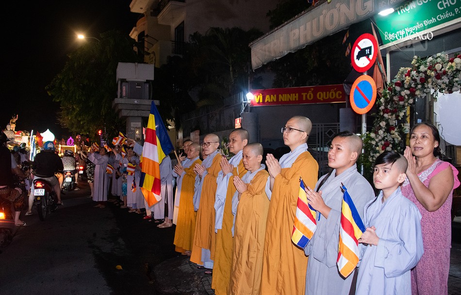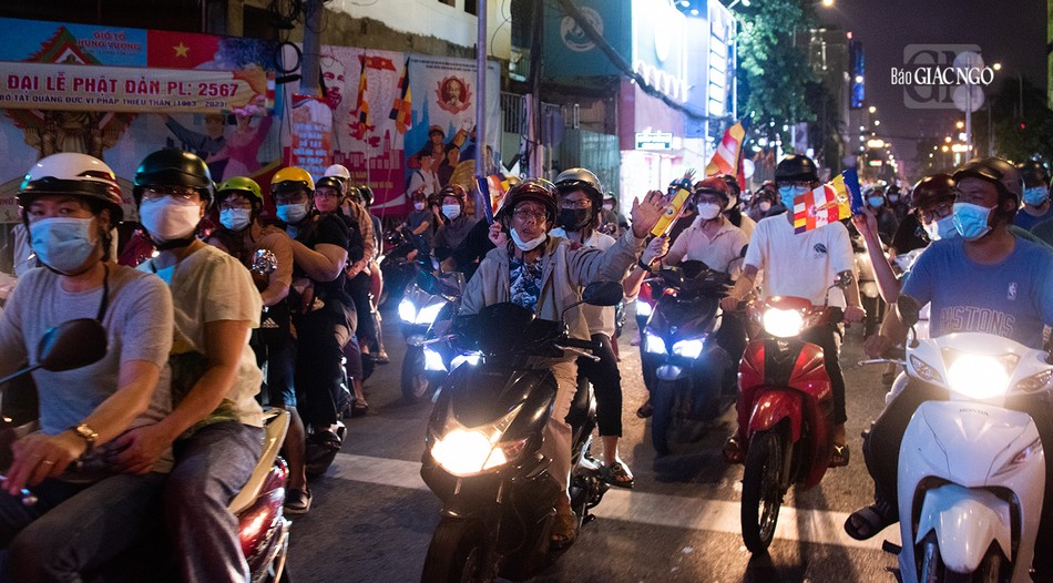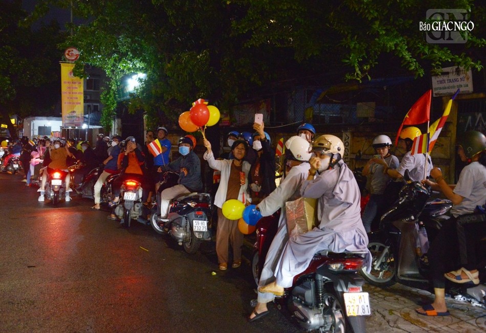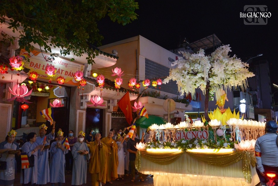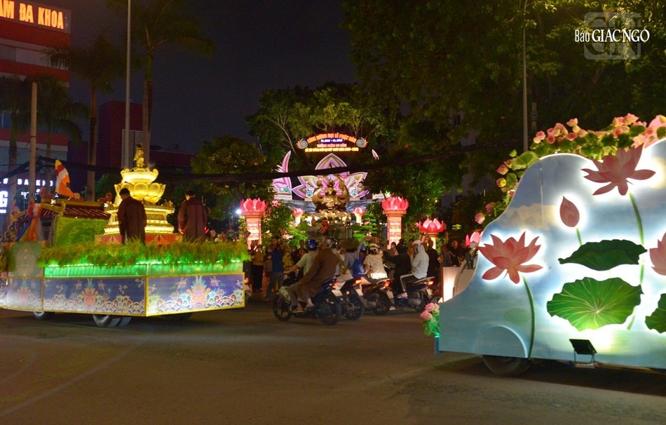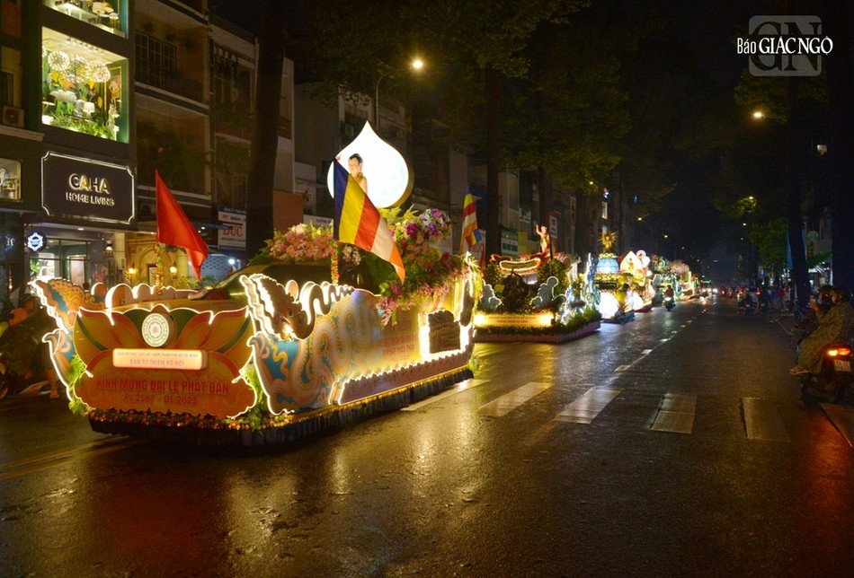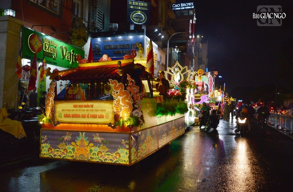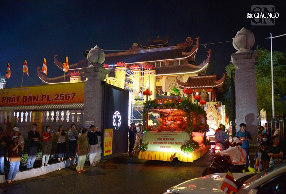 GNO - Đoàn xe hoa đầy sắc màu xuất phát từ lễ đài chính của Phật giáo TP.HCM - Việt Nam Quốc Tự diễu hành đi qua các tuyến phố trong tối 9-4-Quý Mão kính mừng Đức Thế Tôn đản sinh và tưởng niệm 60 năm ngày Bồ-tát Thích Quảng Đức vị pháp thiêu thân.