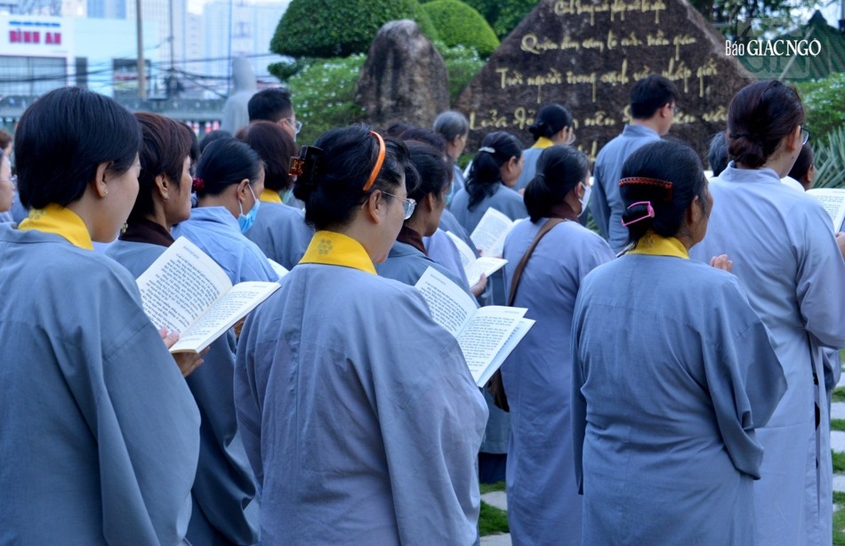 Buổi lễ trước thánh tượng Bồ-tát lộ thiên trong khuôn viên chùa Huê Nghiêm - TP.Thủ Đức (TP.HCM), trung tâm của đạo tràng Pháp Hoa