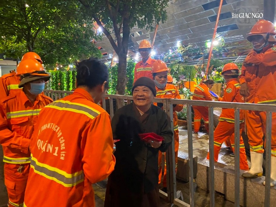 Hình ảnh Ni trưởng Thích nữ Tịnh Nguyện trao lộc Tết đến công nhân môi trường vào rạng sáng nay, 29 tháng Chạp: