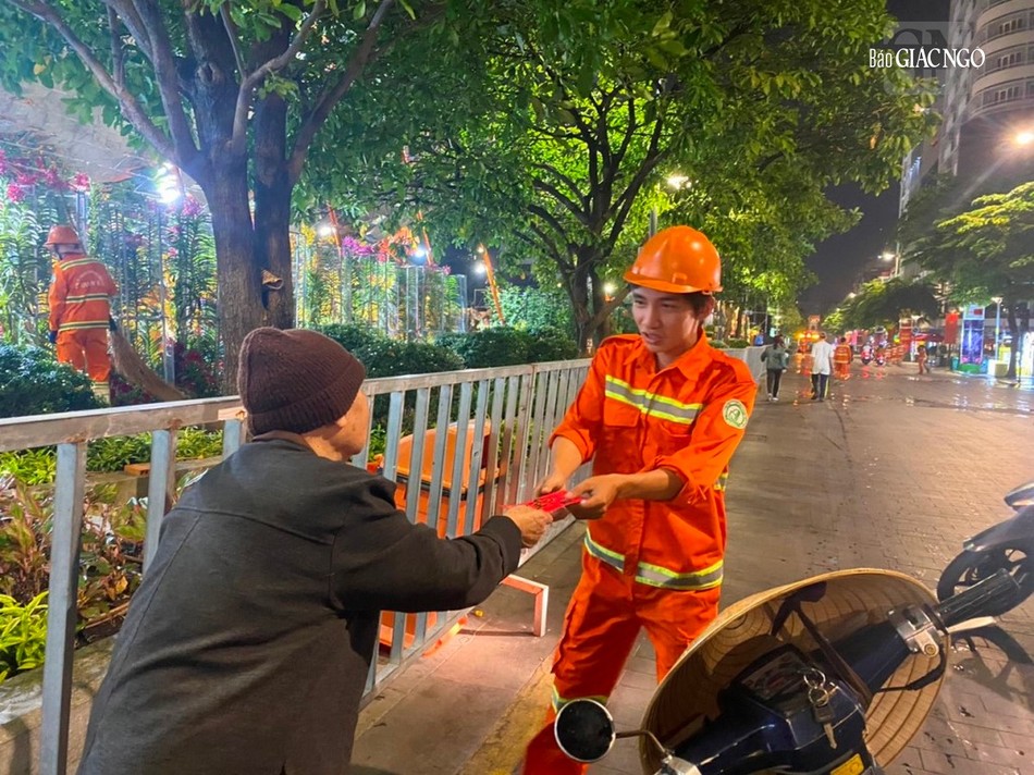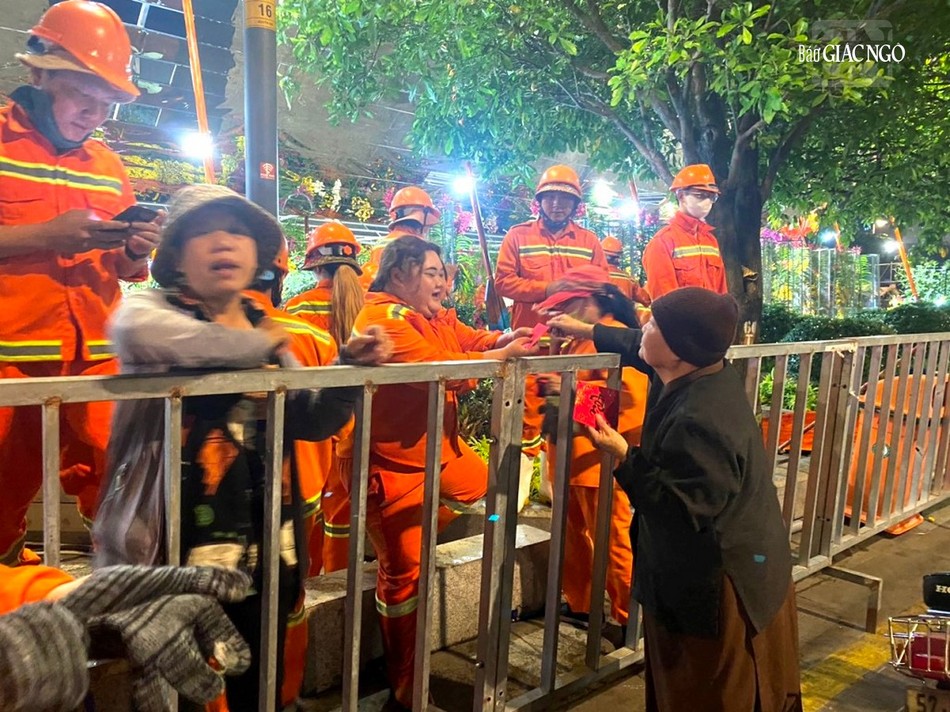 Trên đường phố, Ni trưởng Thích nữ Tịnh Nguyện đã đi trao lộc năm mới đến công nhân làm vệ sinh, bảo vệ trên đường phố đêm khu vực đường Nguyễn Huệ để chia sẻ, động viên công nhân trong ngày cuối năm để góp phần cho thành phố sạch đẹp.