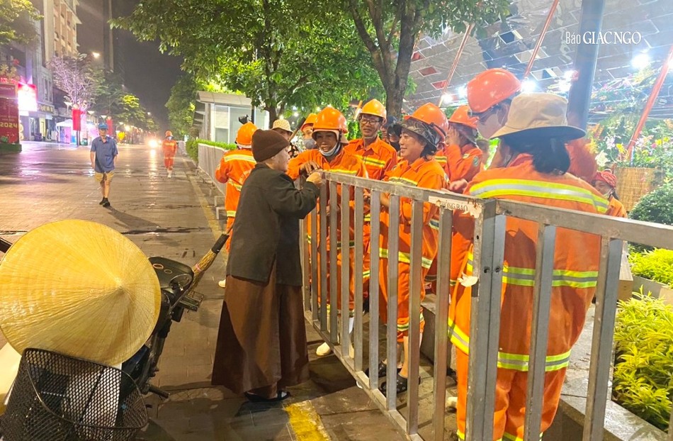 Đã trở thành thông lệ, rạng sáng 29 tháng Chạp hàng năm, chia sẻ với công nhân vệ sinh, môi trường nhân Tết cổ truyền, Ni trưởng Thích nữ Tịnh Nguyện, Trưởng ban Thường trực Phân ban Ni giới T.Ư, trụ trì chùa Phước Hải (Q.10, TP.HCM) với chiếc máy, Sư cô Thích nữ Minh Từ chở Ni trưởng ra khu vực Nguyễn Huệ (Q.1) trao lộc Tết đến công nhân đang làm nhiệm vụ môi trường.