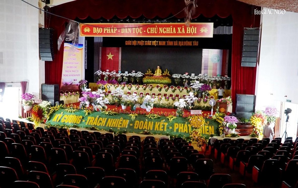 Ghi nhận của phóng viên Giác Ngộ sáng nay từ quốc lộ 51, trên các con đường chính của TP.Bà Rịa dẫn đến Trung tâm Văn hóa tỉnh không khí hân hoan chào mừng đại hội lan tỏa với nhiều biểu ngữ chào mừng đại biểu cùng cờ hoa rực rỡ; cùng không gian văn hóa, triển lãm hình ảnh thành tựu Phật sự của Phật giáo tỉnh được thiết trí trước sảnh trung tâm vui tươi chào mừng đại biểu. Hội trường diễn ra đại hội được thiết trí trang trọng nổi bật chủ đề Đại hội “Kỷ cương - Trách nhiệm - Đoàn kết - Phát triển”, chỉ còn vài chi tiết nhỏ nữa là hoàn thiện.