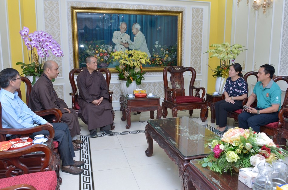 Thượng tọa Thích Tâm Hải cùng ông Trần Xuân Điền và các vị lãnh đạo các phòng thuộc Ban Dân vận Thành ủy TP.HCM đã thông tin, trao đổi nhiều nội dung công tác cũng như các câu chuyện xuân hoan hỷ.