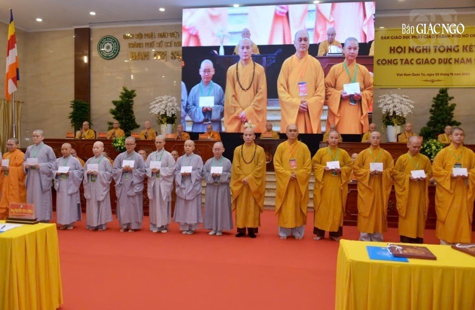 Dịp này, Ban Trị sự GHPGVN TP.HCM đã tặng Bằng tuyên dương công đức cho tập thể Ban Giáo dục Phật giáo Thành phố; Bằng công đức đến 7 tập thể và 29 cá nhân.