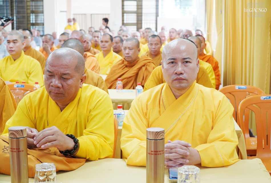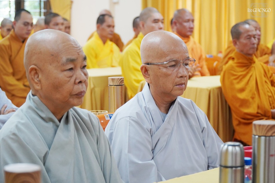 Thay mặt Ban Trị sự tỉnh, Thượng tọa Thích Thiện Thông, Phó Thư ký kiêm Chánh Văn phòng Ban Trị sự báo cáo sơ nét công tác tổ chức khóa An cư kiết hạ Phật lịch 2568 của tỉnh Bà Rịa - Vũng Tàu. Theo đó, toàn tỉnh có 23 điểm an cư tại các huyện, thị xã, thành phố với tổng cộng 2.556 hành giả an cư.