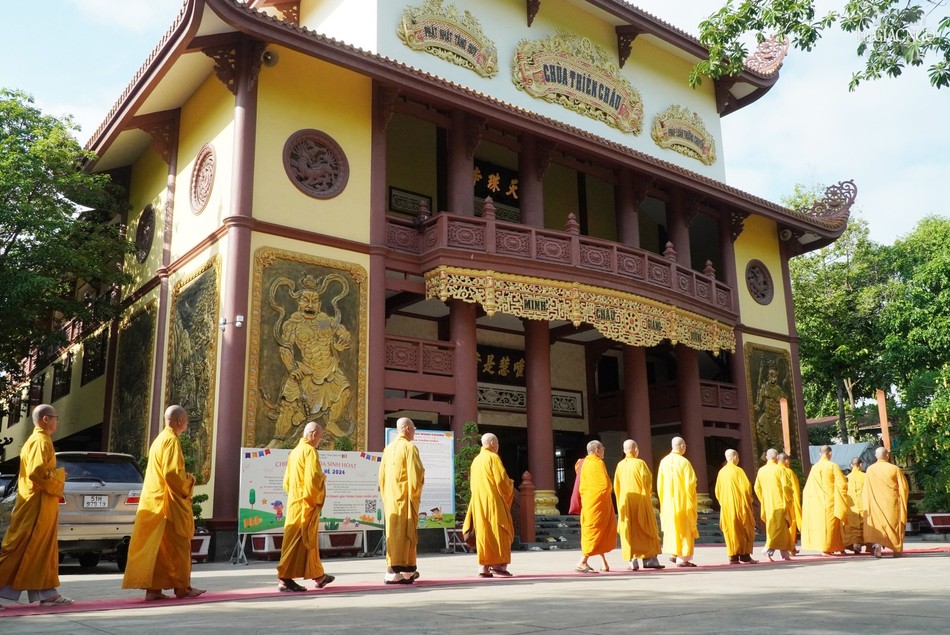 Tiếp đoàn tại trường hạ chùa Thiên Châu (TP.Tân An, tỉnh Long An), sáng ngày 2-7, có sự chứng minh của Trưởng lão Hòa thượng Thích Thiện Huệ, Thành viên Hội đồng Chứng minh; Hòa thượng Thích Thiện Tài, Chứng minh Ban Trị sự GHPGVN tỉnh; Hòa thượng Thích Minh Thiện, Ủy viên Hội đồng Trị sự, Phó ban Hoằng pháp T.Ư, Trưởng ban Trị sự GHPGVN tỉnh Long An; cùng chư tôn đức Ban Thường trực Ban Trị sự GHPGVN tỉnh; Ban Trị sự các huyện, thị xã, thành phố; Ban Chức sự, Tăng Ni 13 điểm an cư và Phật tử.