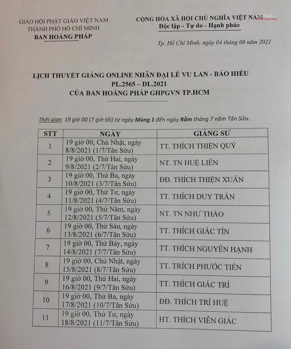Chư tôn đức Giảng sư đoàn thuộc Ban Hoằng pháp sẽ thuyết giảng online với khung thời gian cụ thể, gồm 15 buổi thuyết giảng của 15 vị giảng sư trong mùa Vu lan - Báo hiếu năm nay.